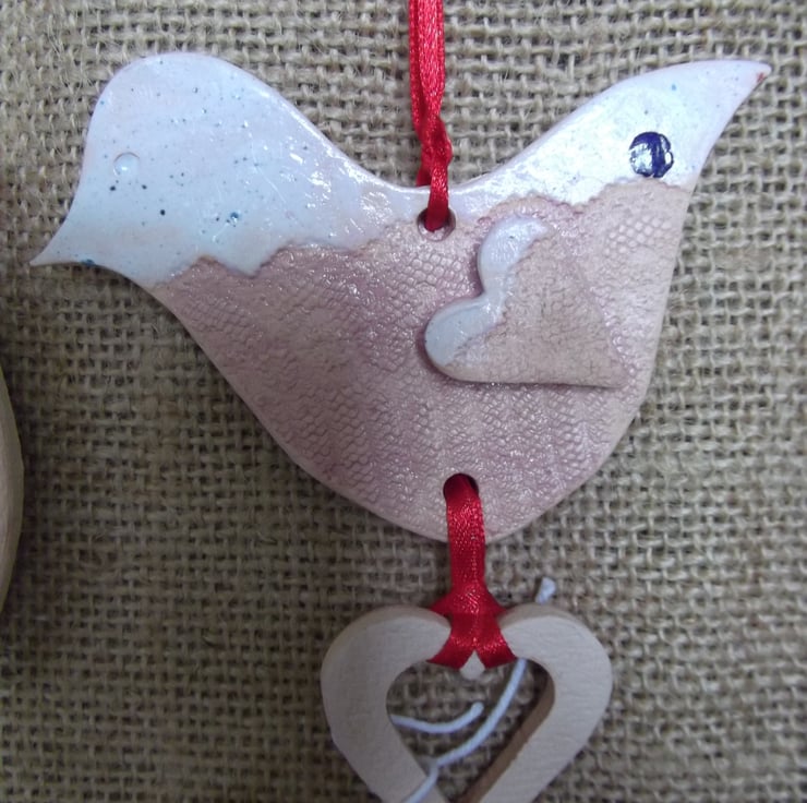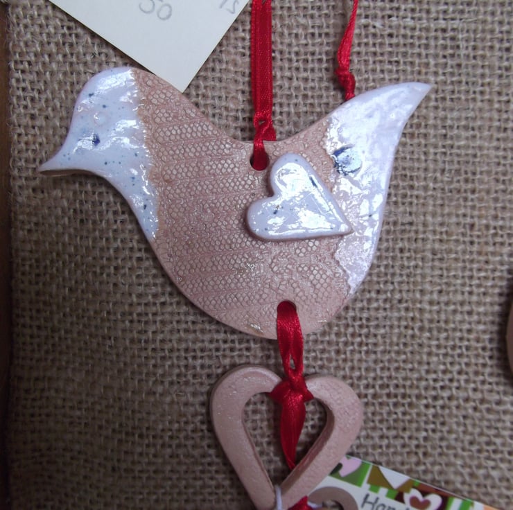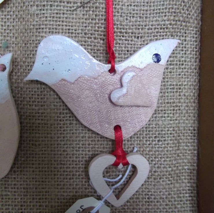 Beautiful, contemporary and slightly different, these ceramic hanging decorations are all individually handmade from stoneware clay. Once rolled by hand, antique lace is impressed into part of the clay and the shapes are cut using a template. The decorations are twice fired and finished with a really unique white and blue glaze and a pale lilac body stain. Hang with the ribbon where ever you wish!