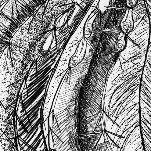 Hard ground etching from a zinc plate using oil based inks and run through a printing press. I was inspired by the pattern repetition in this cactus form. I often start print projects with line drawing; I love the simplicity of the black and white image.