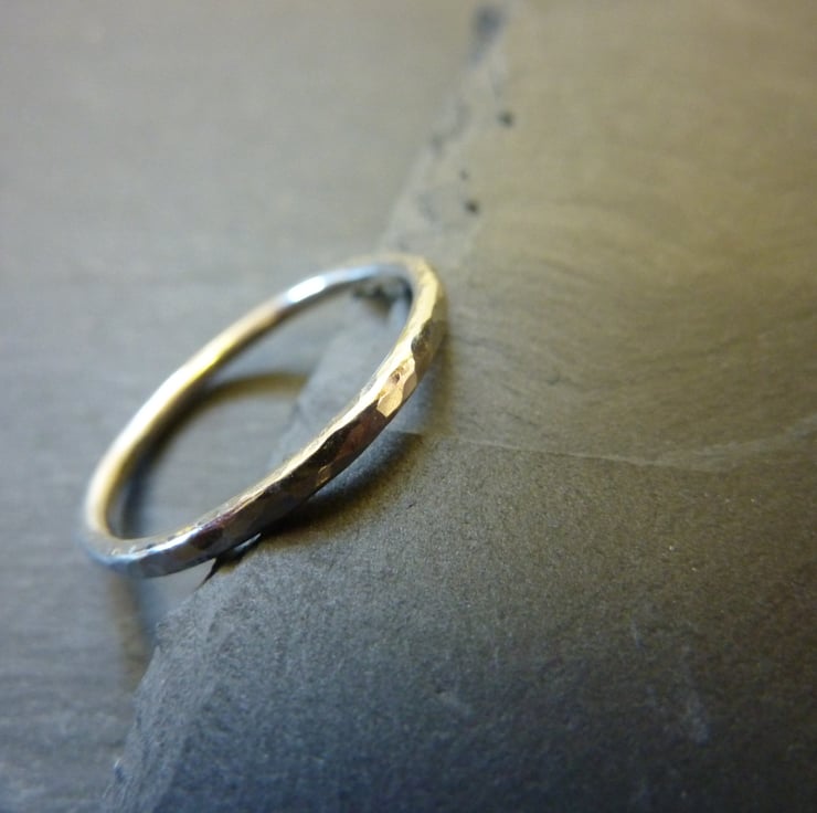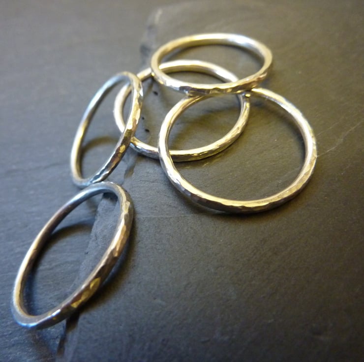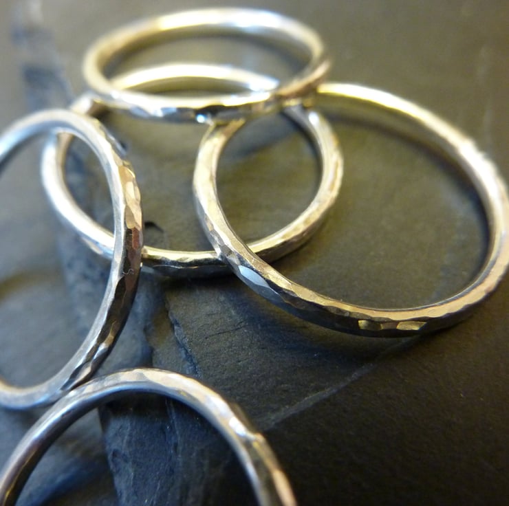 These rings have been handmade from 1.5mm sterling silver round wire. They have been hammered lightly to reflect the light and hand polished to a shiny finish. They look lovely on their own or can be stacked with two, three or more - it is up to you.