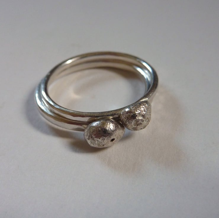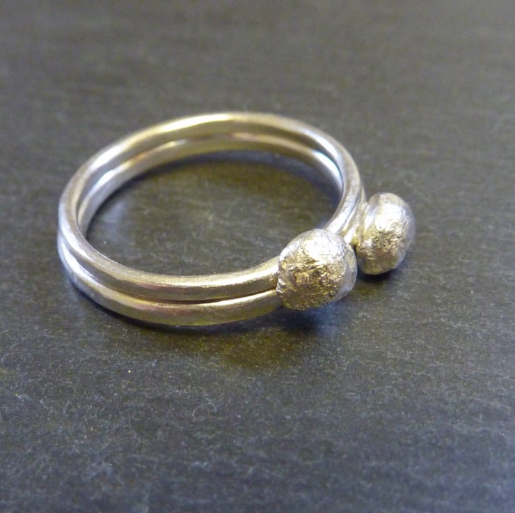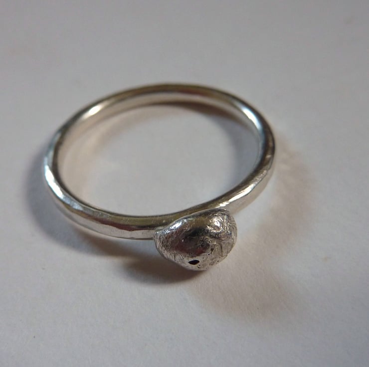 This ring has been handmade from sterling silver 2mm round wire and lightly hammered to catch the light. The silver nugget is made from recycled scraps of sterling silver that have been heated and fused together. This is then soldered on to the top of the ring to make an attractive natural 'stone' setting. It has been polished by hand to a shiny finish. These rings look lovely on their own or can be stacked with two, three or more plain or nugget rings - it is up to you.