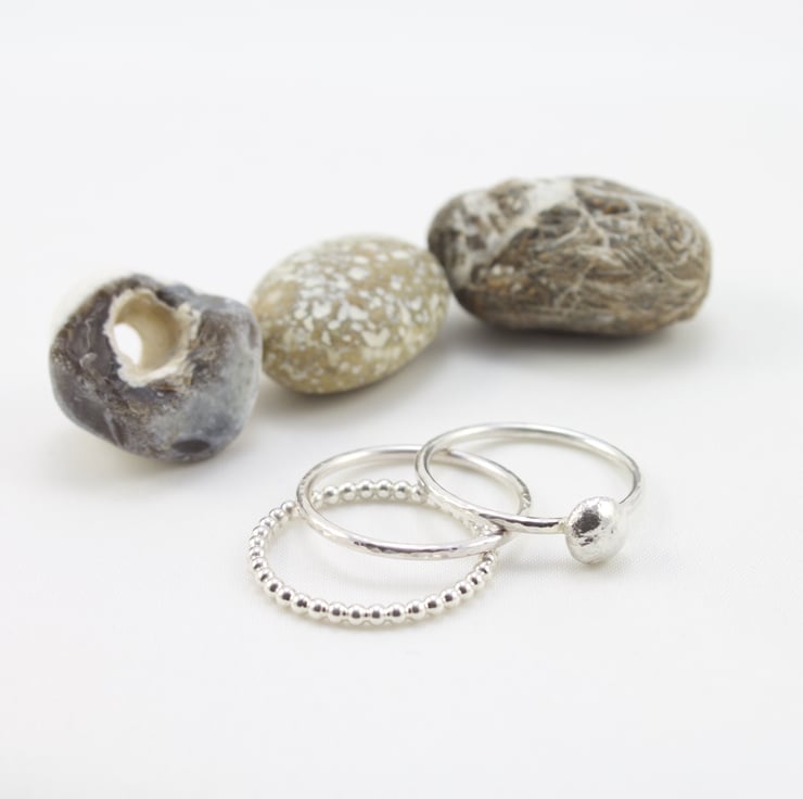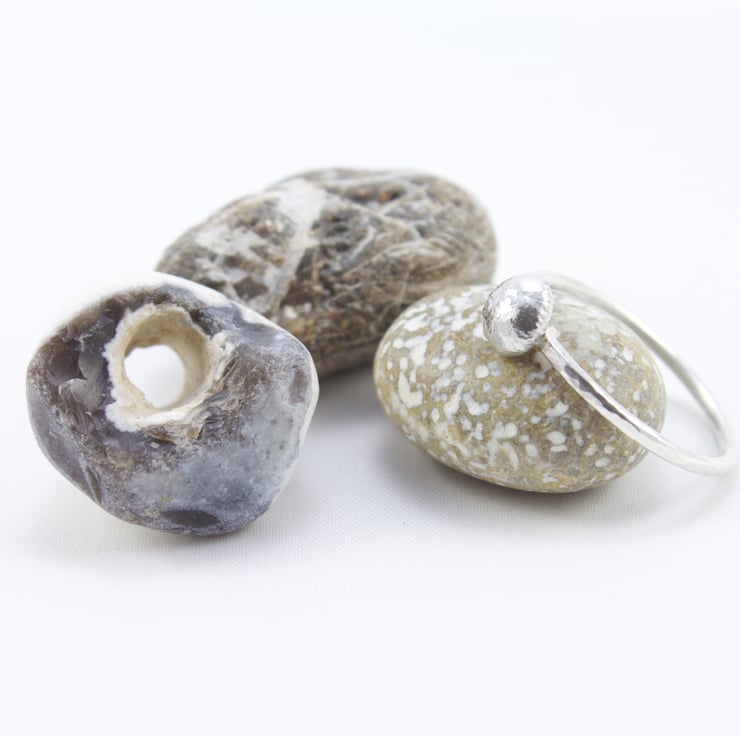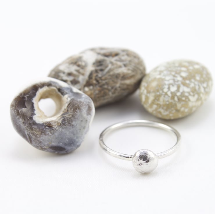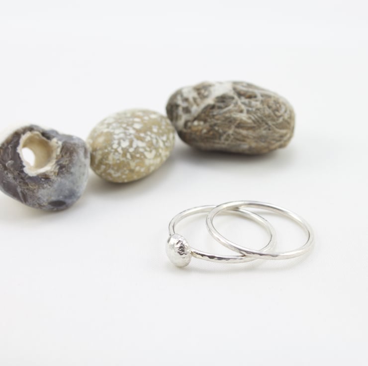 This ring is made by hand from sterling silver 1.5mm round wire and lightly hammered to catch the light. The silver nugget is made from recycled scraps of sterling silver that have been heated and fused together. This is then soldered on to the top of the ring to make an attractive natural 'stone' setting. It is then polished by hand to a shiny finish. These rings look lovely on their own or can be stacked with two, three or more plain or nugget rings - it is up to you.