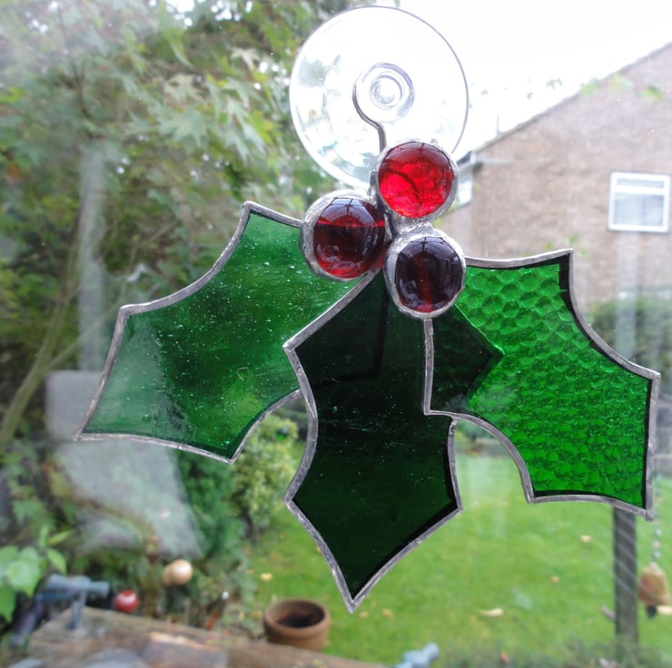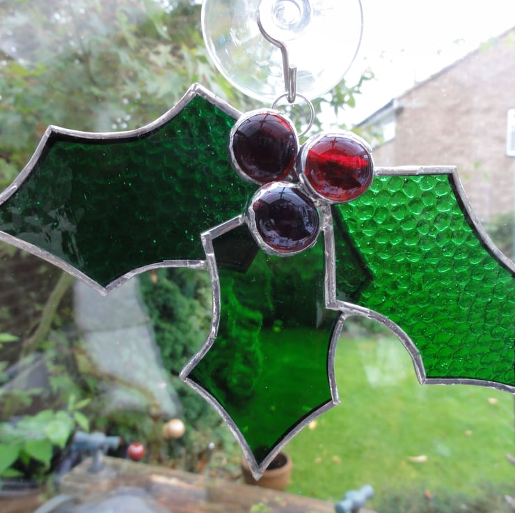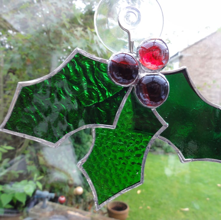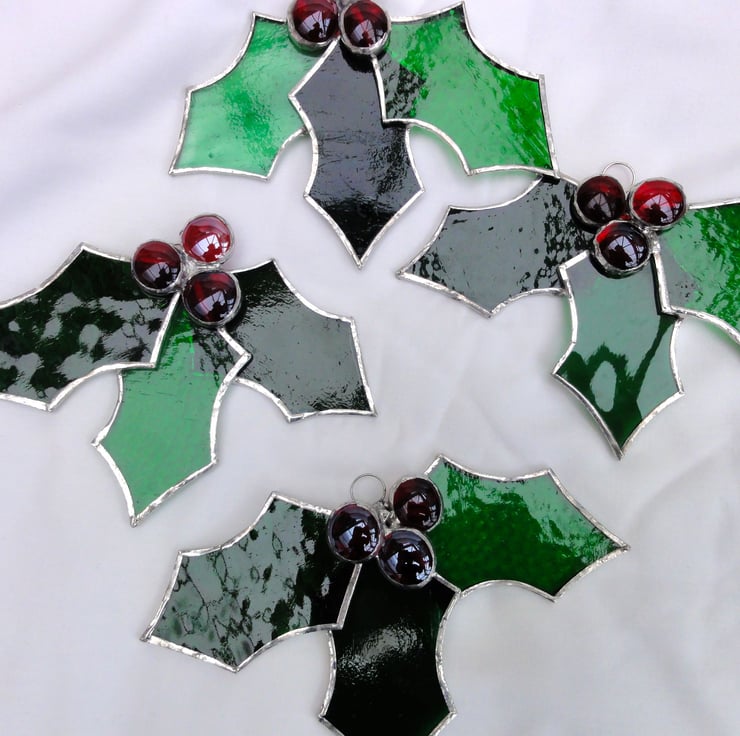 These suncatchers are made from a selection of three different textured green glass and three red nuggets for the berries. Each piece of glass has been coper foiled and solder together, a ring has been attached for hanging purposes.