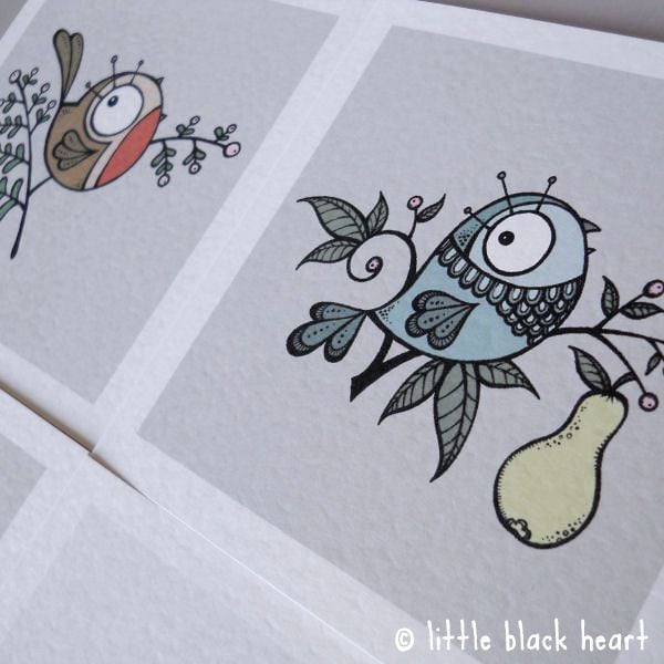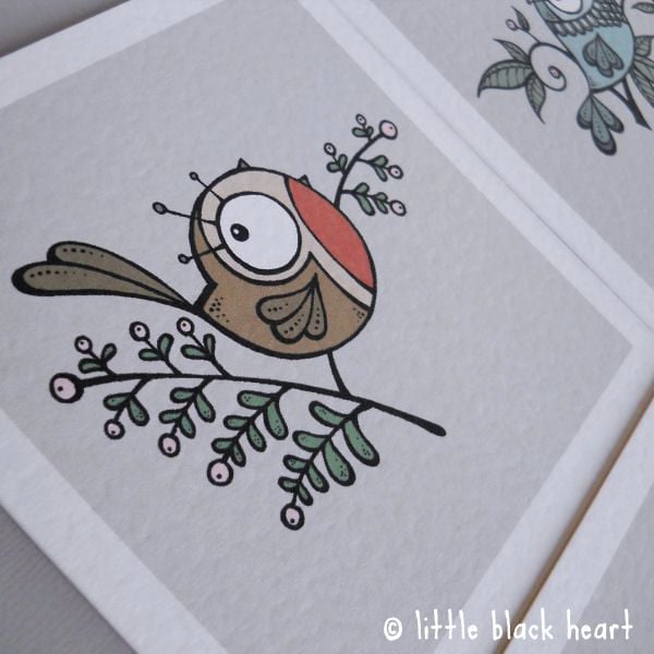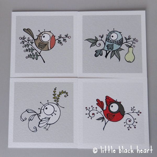 this listing is for a pack of 4 christmas cards, one each of my little bird designs: