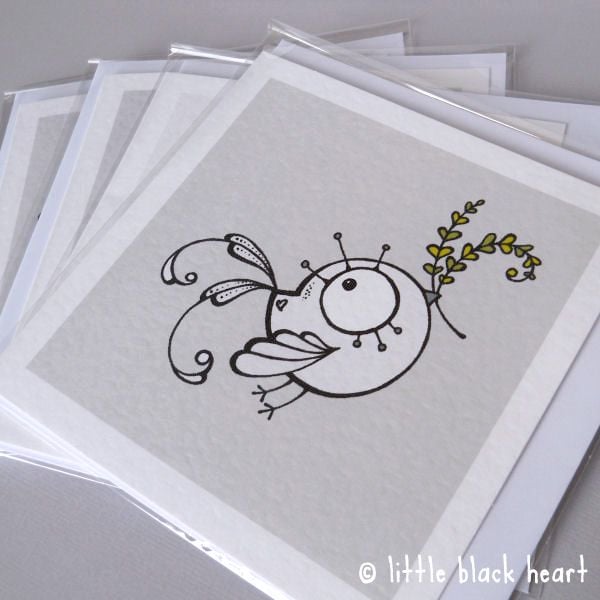 each design is one of my original hand drawings; it is scanned in and coloured digitally, and then printed onto good quality textured matt white card (300gsm). they measure approx. 120mm x 120mm square, and each comes with a white envelope, sealed in a cellophane bag.