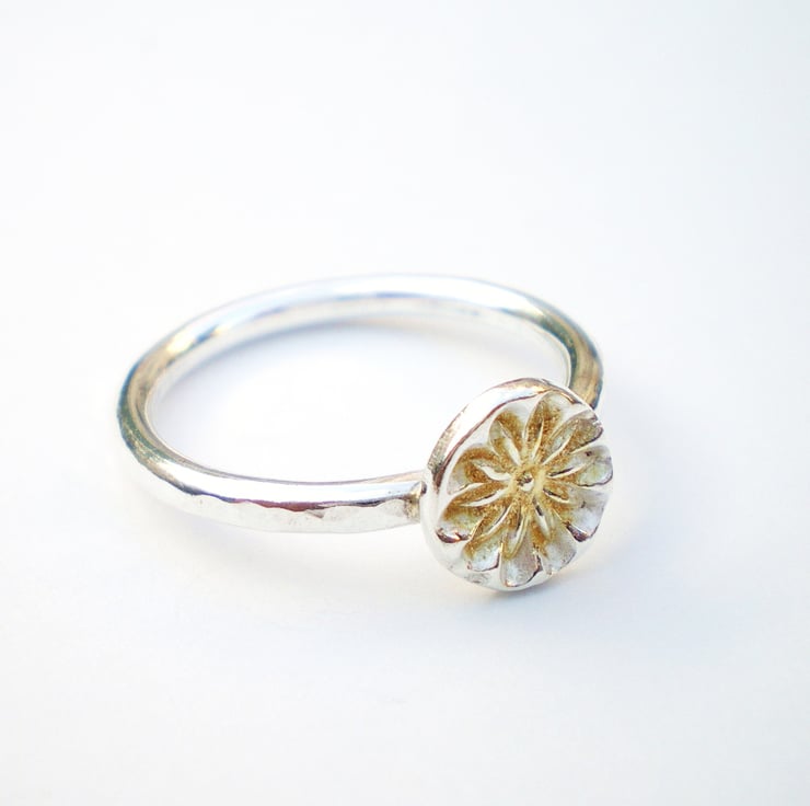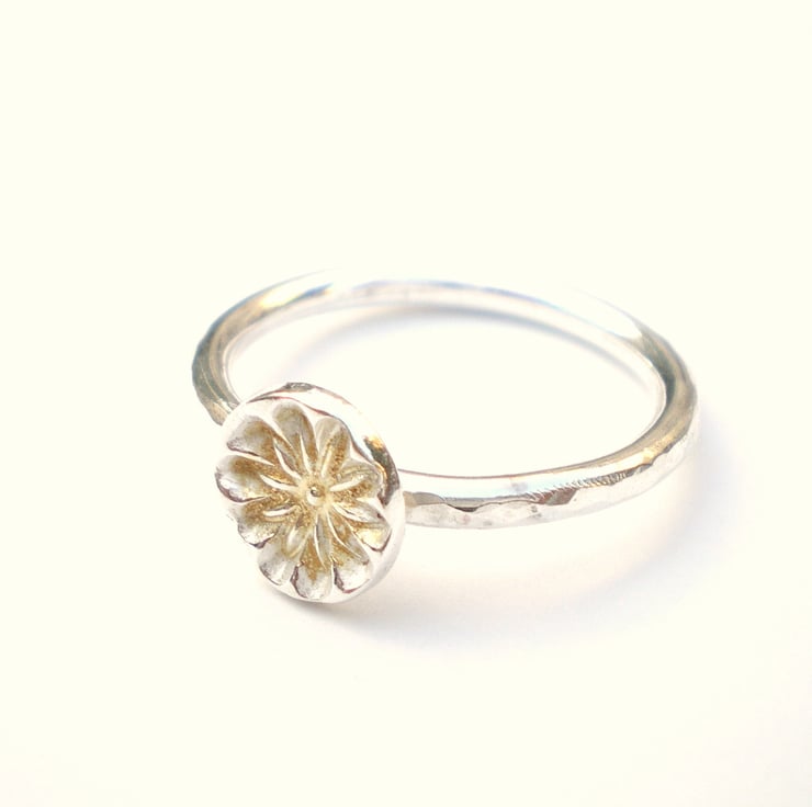 A pretty sterling silver hammered ring with a fine silver and 24ct gold flower.
