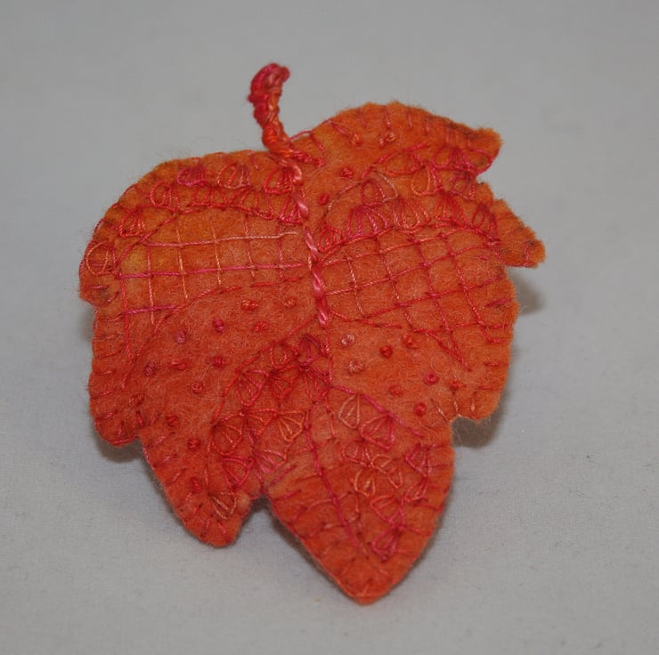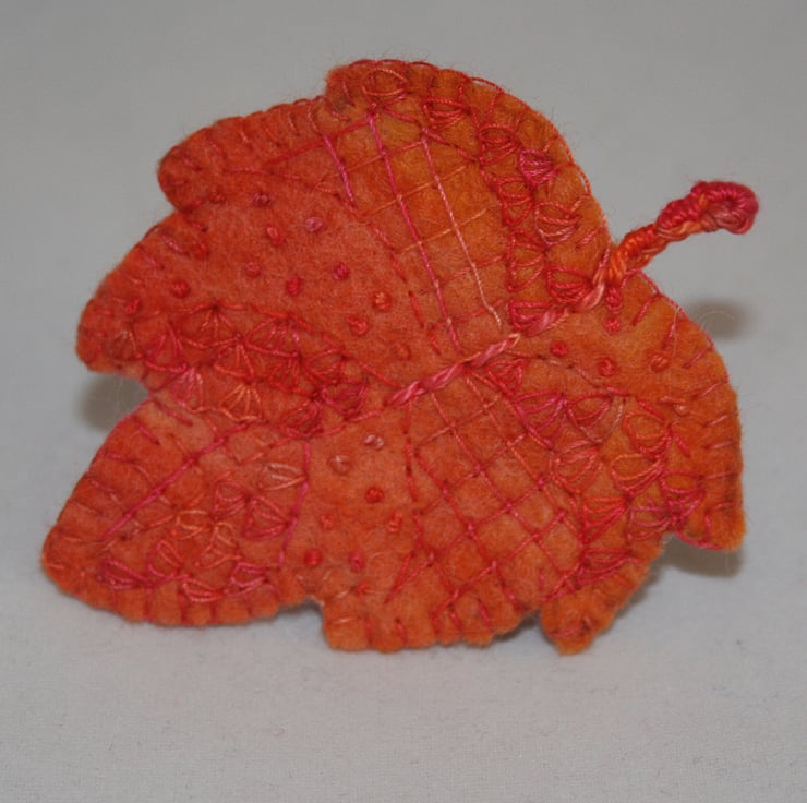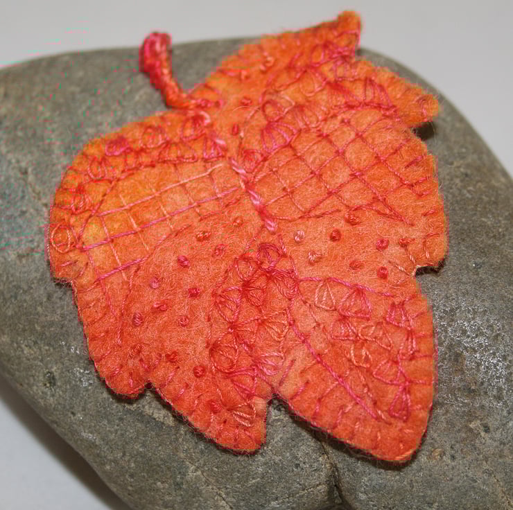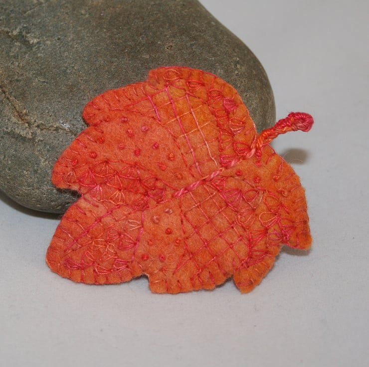 A striking brooch in the form of a heavily embroidered felt leaf - this textile brooch would look great on a winter coat or jacket.