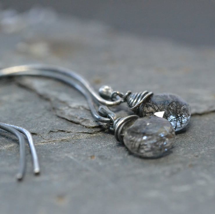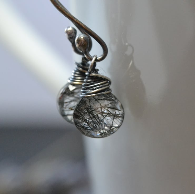 Yummy - sterling silver wrapped tourmalinated quartz. The clarity of quartz, with random dark strands held within. I find these beautiful stones completely hypnotic!