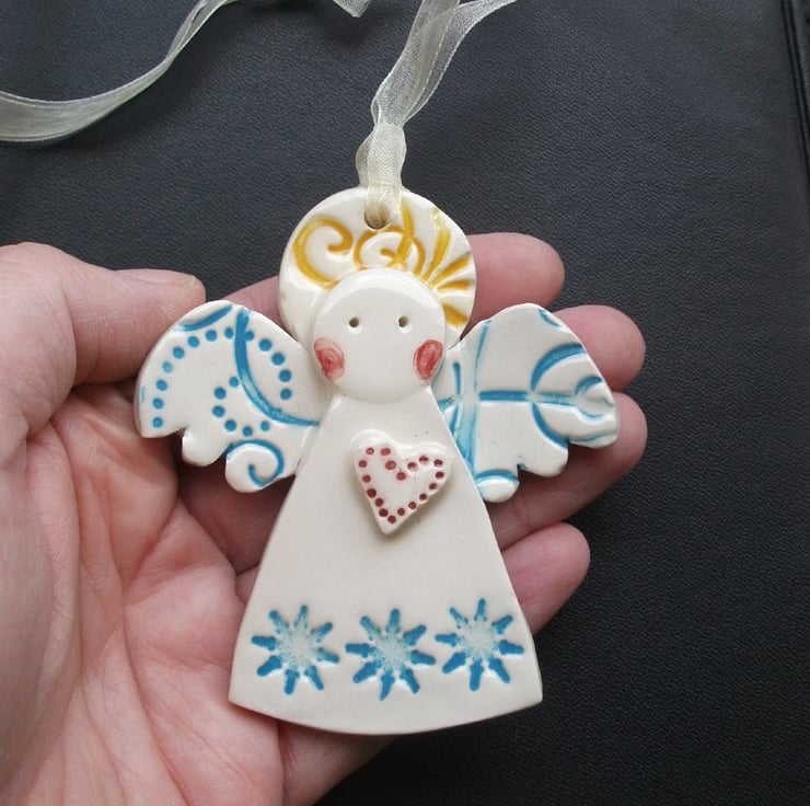 These cute little angels are made from white earthenware clay and decorated with coloured slips and glazes.
