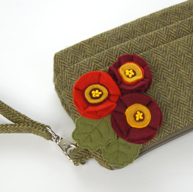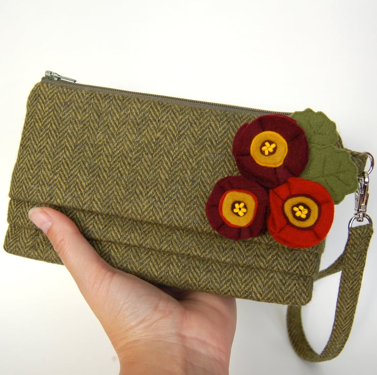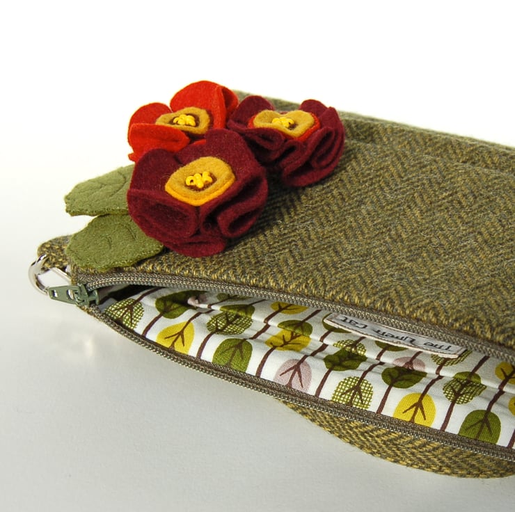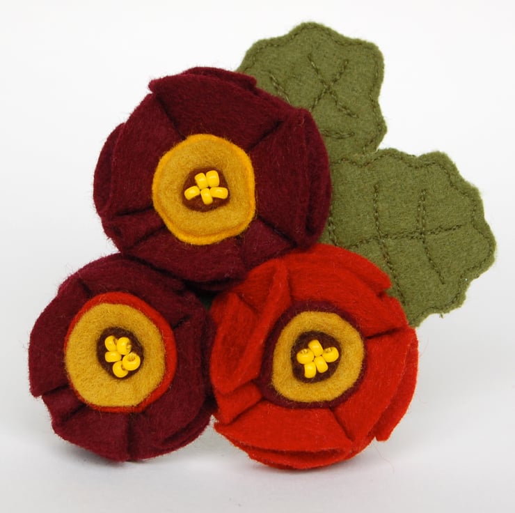 Removable flower brooch in mixed orange wool felt (in the style of an Auricula flower), with wool fabric leaves.