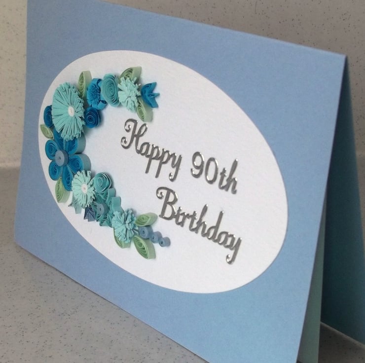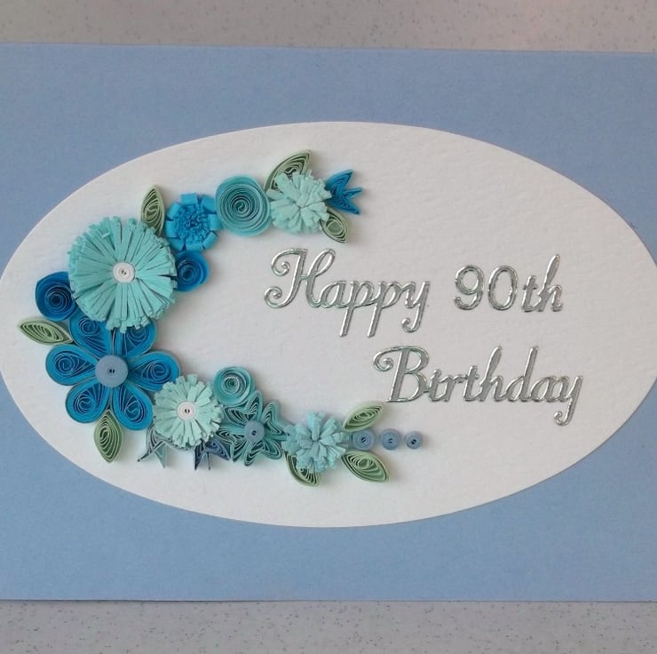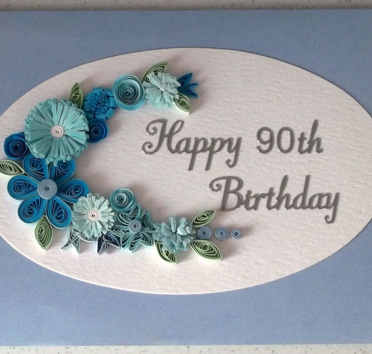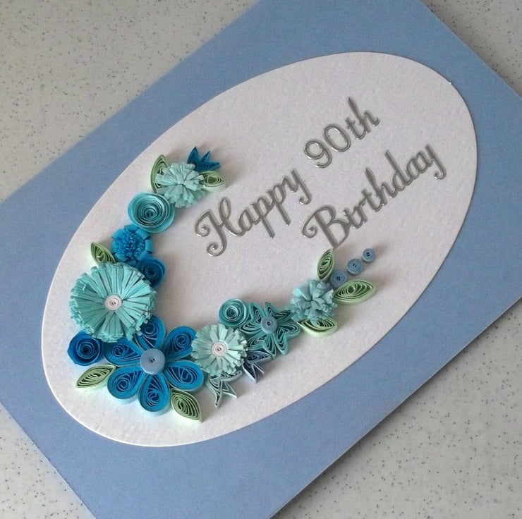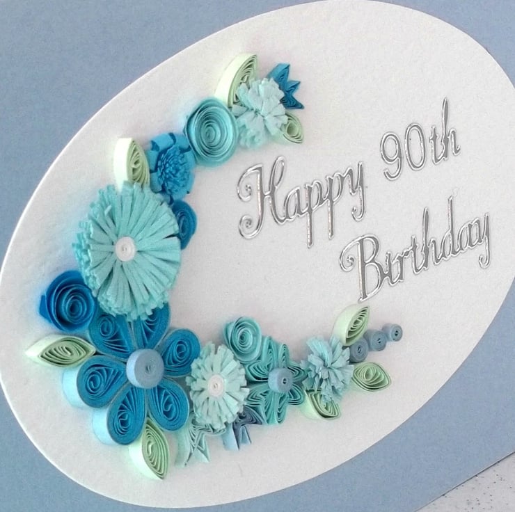 A beautiful quilled birthday card with quilling flowers in shades of blue, perfect for sending special 90th congratulations to anyone special.