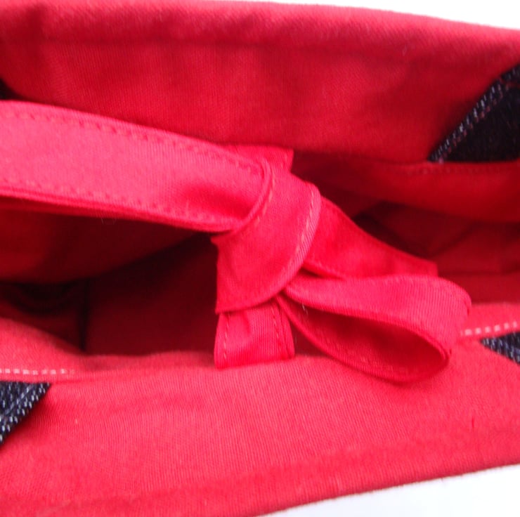 It is fully lined in a red cotton fabric , and a red fabric tie as fastener.