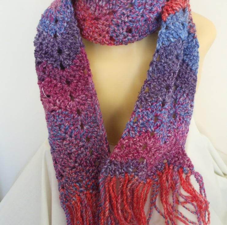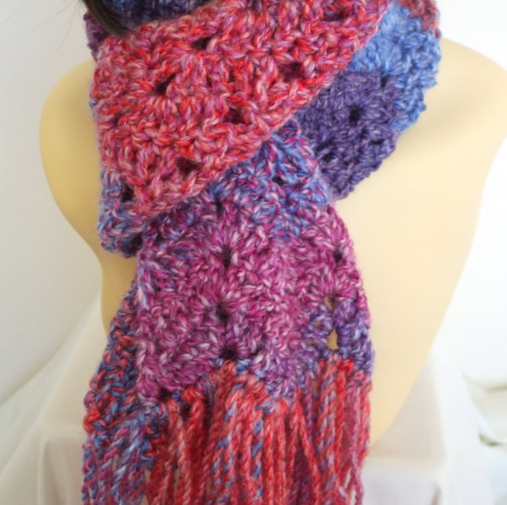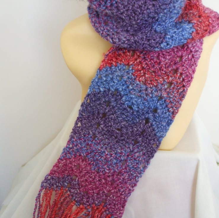 Crocheted ripple pattern scarf in a soft acrylic chunky yarn.