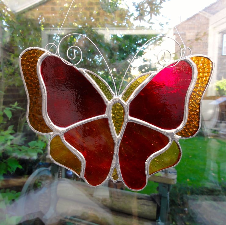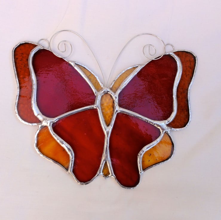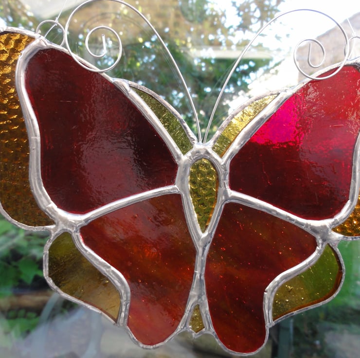 This beautiful handmade butterfly has been made from a selection of different coloured and textured red and amber stained glass.