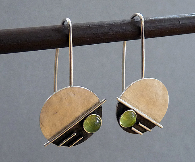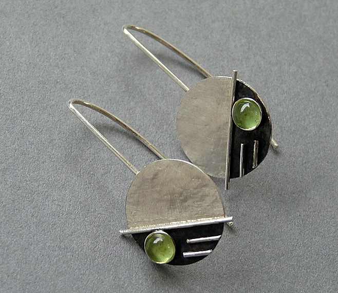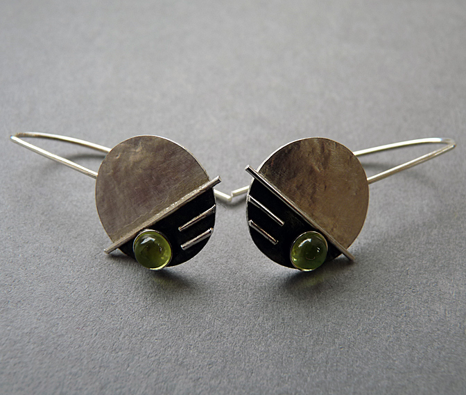 These contemporary earrings with Peridot are entirely hand made in sterling silver. They have been textured, partially oxidized and polished to a bright and shiny finish. They have handcrafted, sterling silver ear hooks soldered to them.