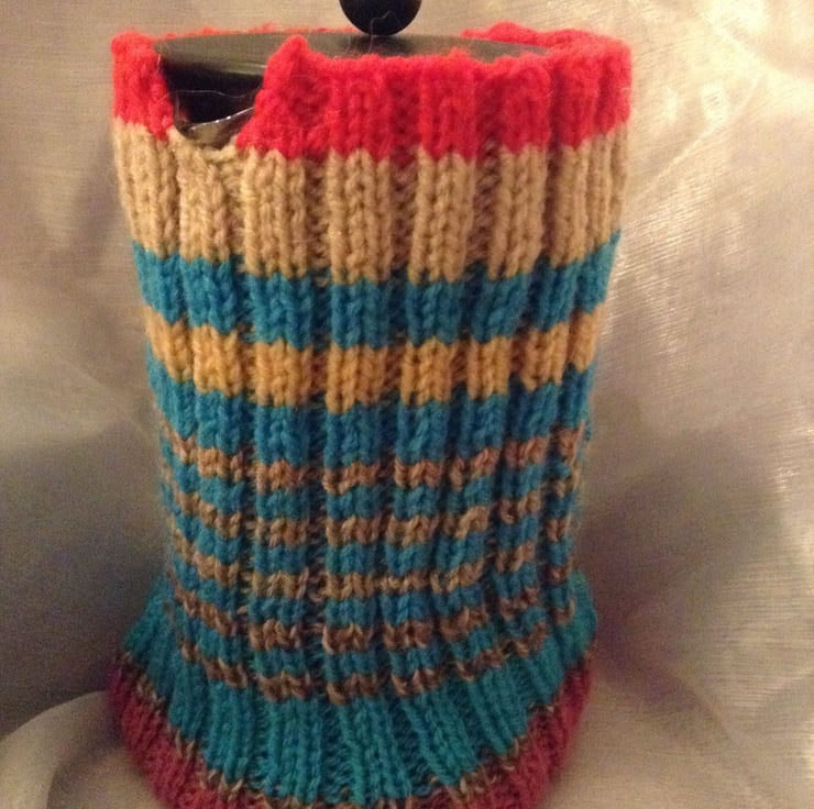 Funky knitted stripy Cafetiere cosy. For an 8 cup Cafetiere. Machine washable. Has buttons to close around the handle. Let us know which you would like.