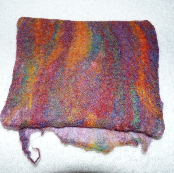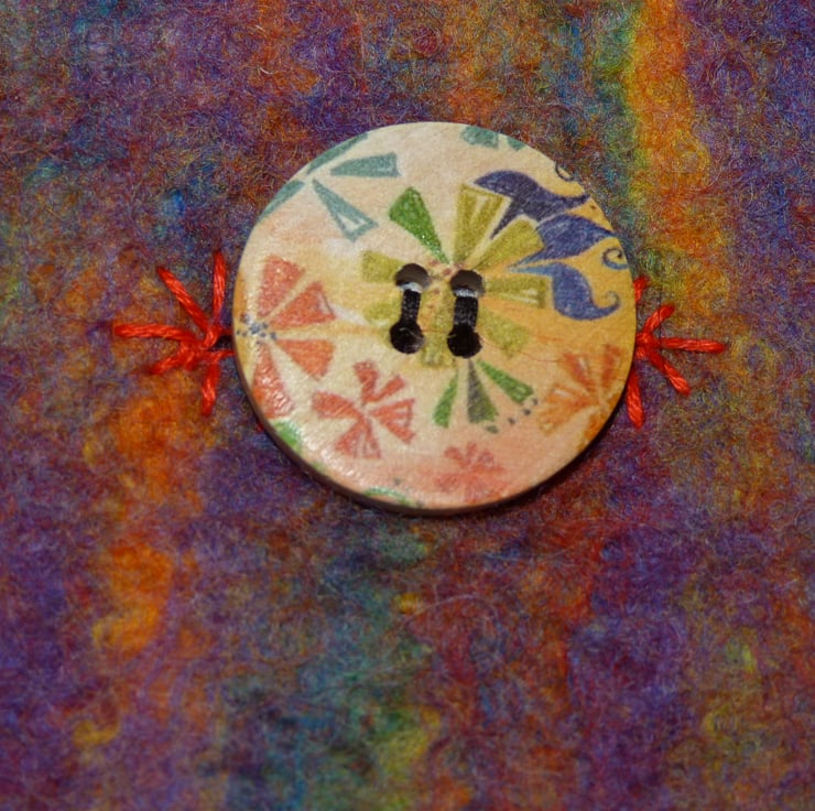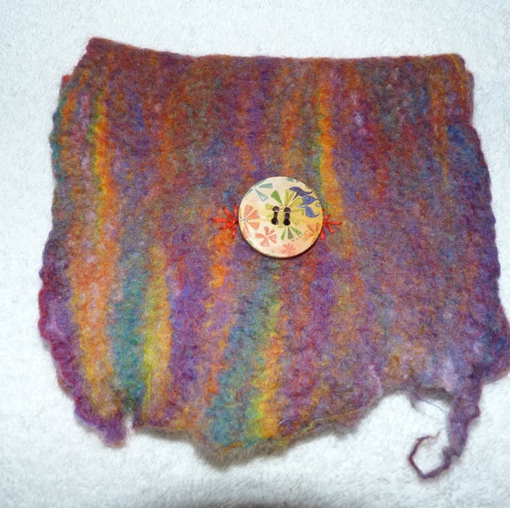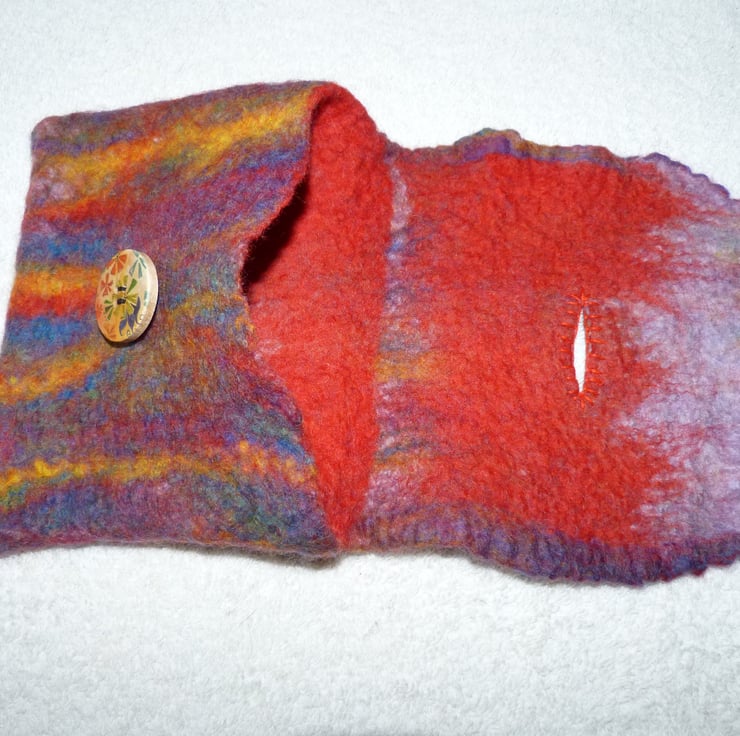This hand felted purse has been created from 100% pure merino fibers in the colours of the rainbow. The inside of the purse is mainly red. The felt was created as one complete piece over a former, with hand embroidery to decorate the button hole. I have sewn on a wooden button decorated with flowers to complete the purse.