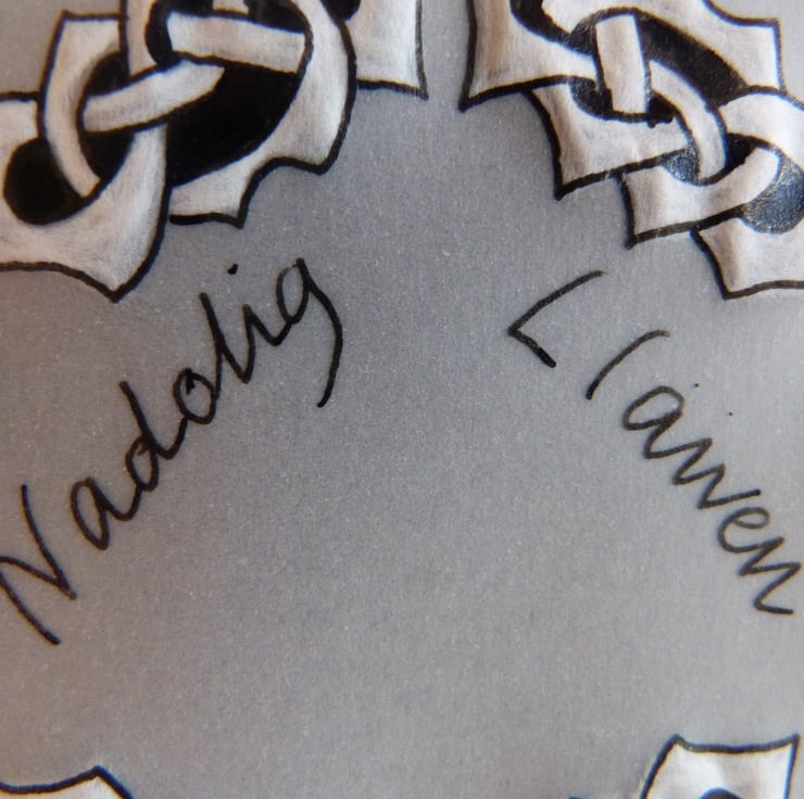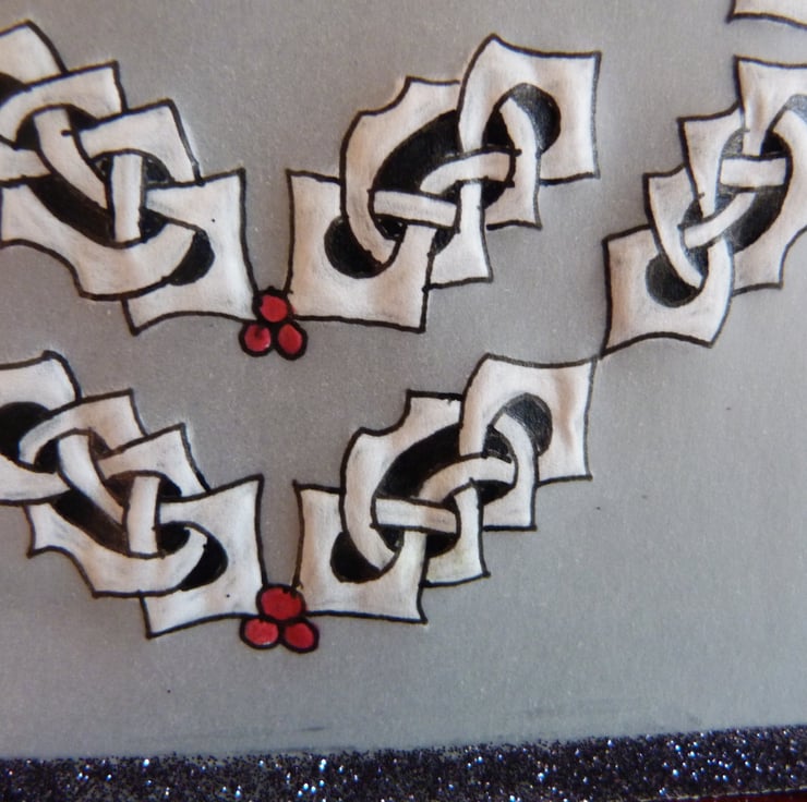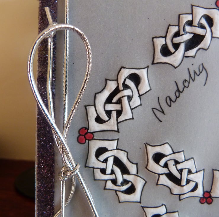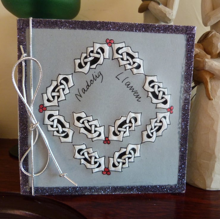 A Celtic wreath of holly and berries embossed onto parchment paper. Mounted onto quality black card. Embellished with a silver cord bow and fine black glitter. The words Nadolig Llawen further decorates.