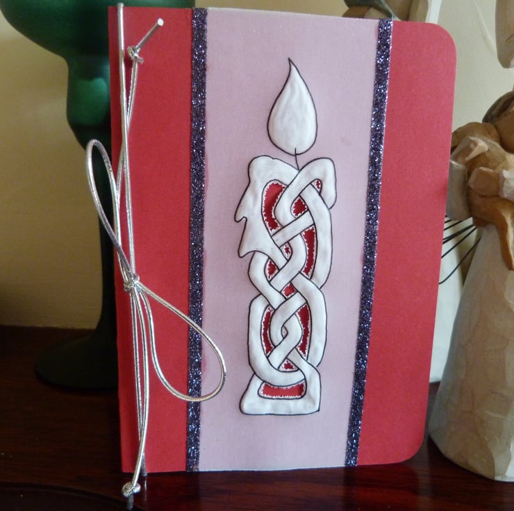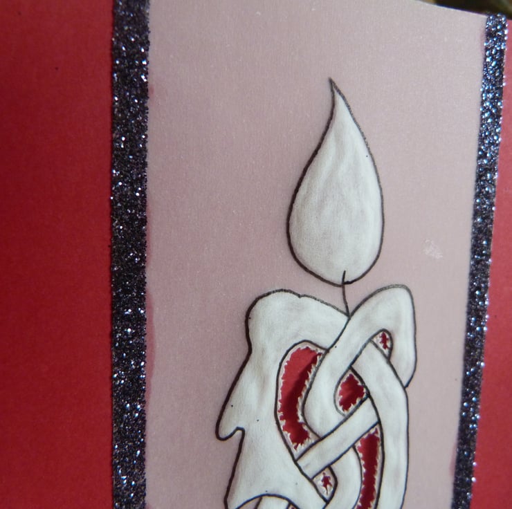 A beautiful modern design of a Celtic candle embossed, pierced and cut out of parchment paper, mounted onto bright red quality card. Edged with fine black glitter and a silver cord bow.