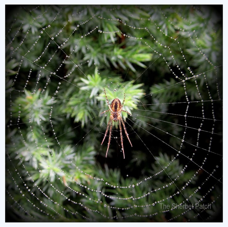 Raindrops on a delicate web, the spider irridescent against the solid green of the conifer.