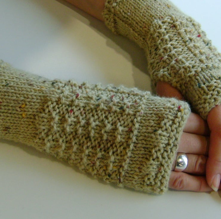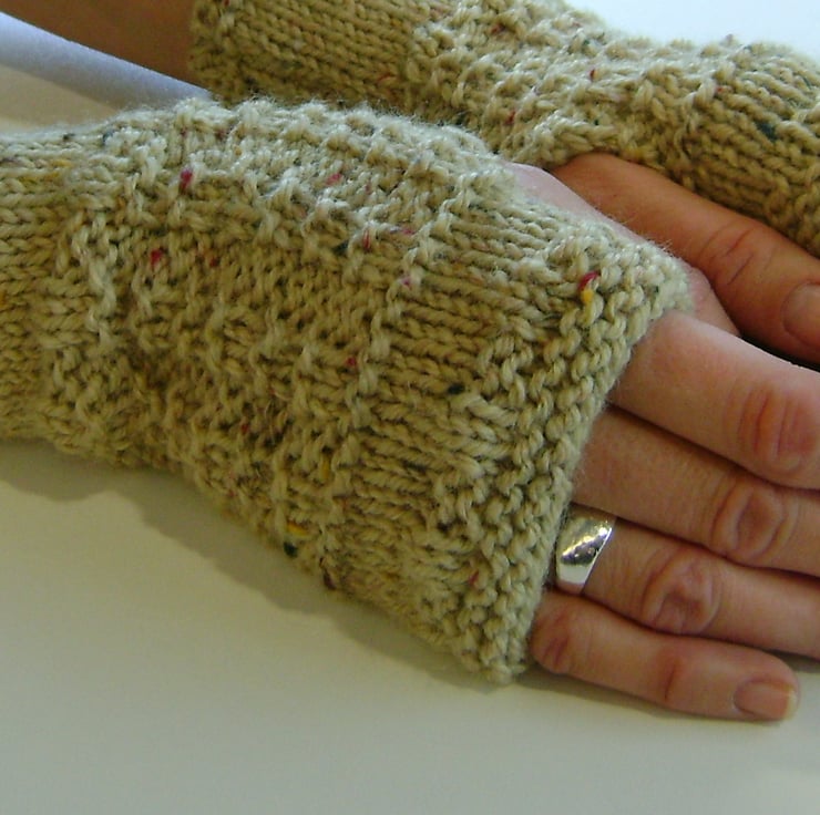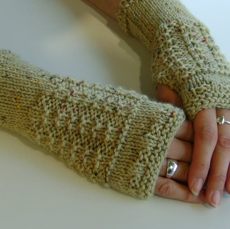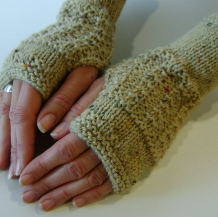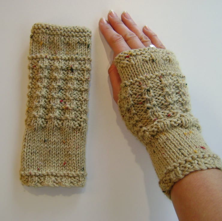 These lovely and soft sand colour cosy fingerless mittens / wrist warmers / gloves are knitted with a pretty waffle pattern and have a touch of tweed in them. They are made from 25% Aran wool and are 8 inches long.