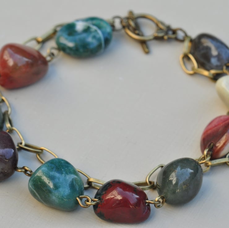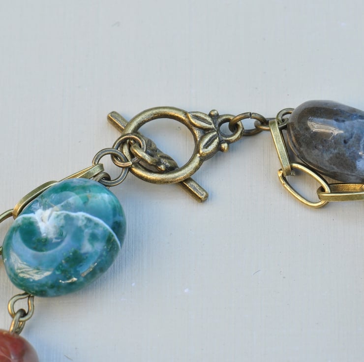 Lovely beaded bracelet comprising of one strand of Ocean Jasper Nugget gemstone beads with a strand of antique bronze chain, finished with a toggle clasp.