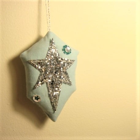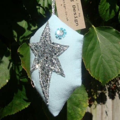 Handmade in neat ice blue cotton each with a wonderful glitter fabric star motif. 6cm across, hangs approx 16cm long including loop.
