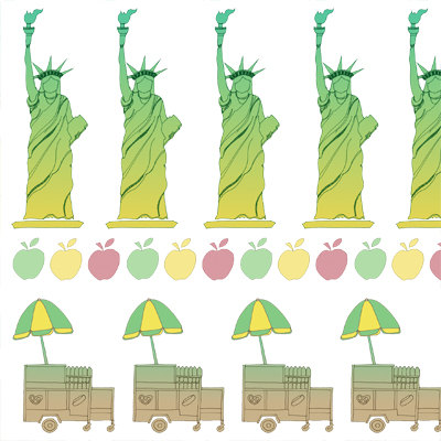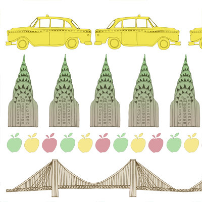 Illustration print A3, with quote I love NY (new york). Hand drawn New York landmarks, The Statue of Liberty, yellow new york cab, Met, brooklyn bridge, chrysler building, a hotdog cart and some big apples, all in shades of yellow, green, and brown. The poster has a white border suitable for framing.