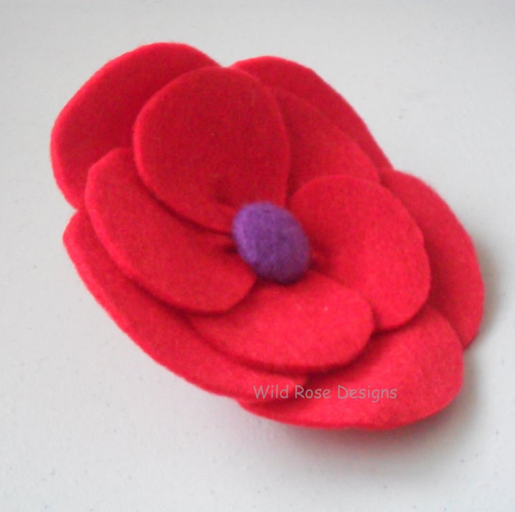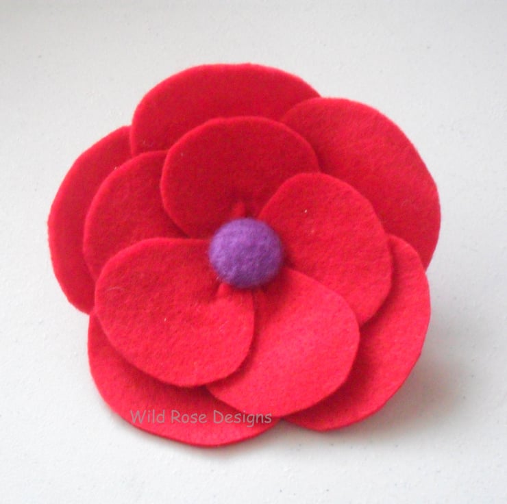 A lovely handmade felt brooch available in 3 colourways: Red with a purple centre, Pink with a blue centre or Blue with a pale pink centre. This listing is fo the red brooch.