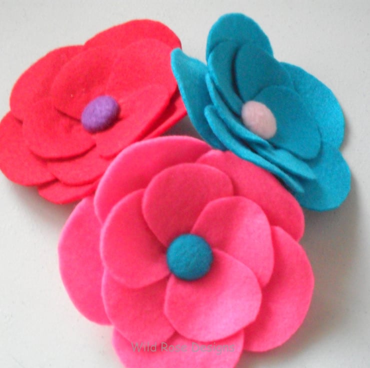 Each felt flower measures approximately 11.5cm in diameter and there is a brooch pink on the back.