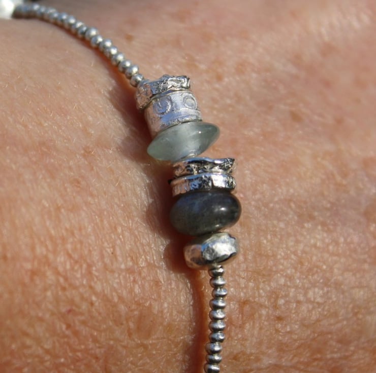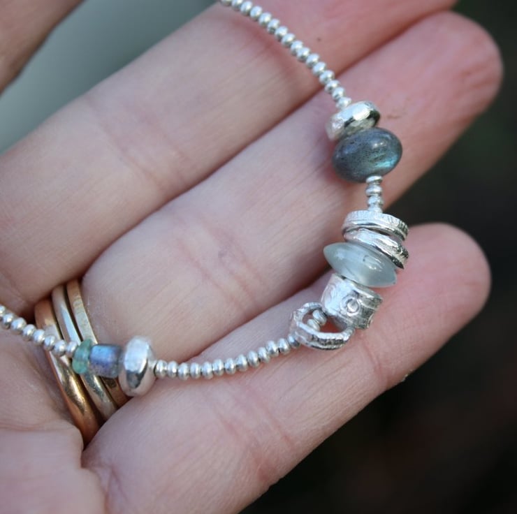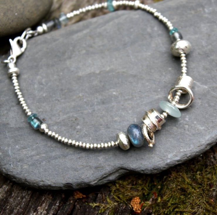I have combined small 2mm solid silver beads with a selection of labradorite and apatite and in the central section I have added 4 fused textured slider beads and an aquamarine.