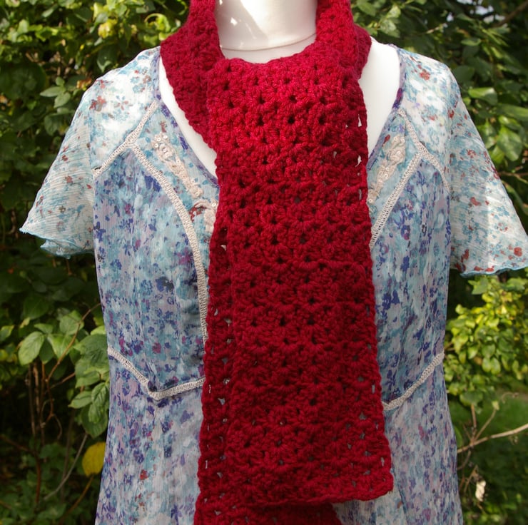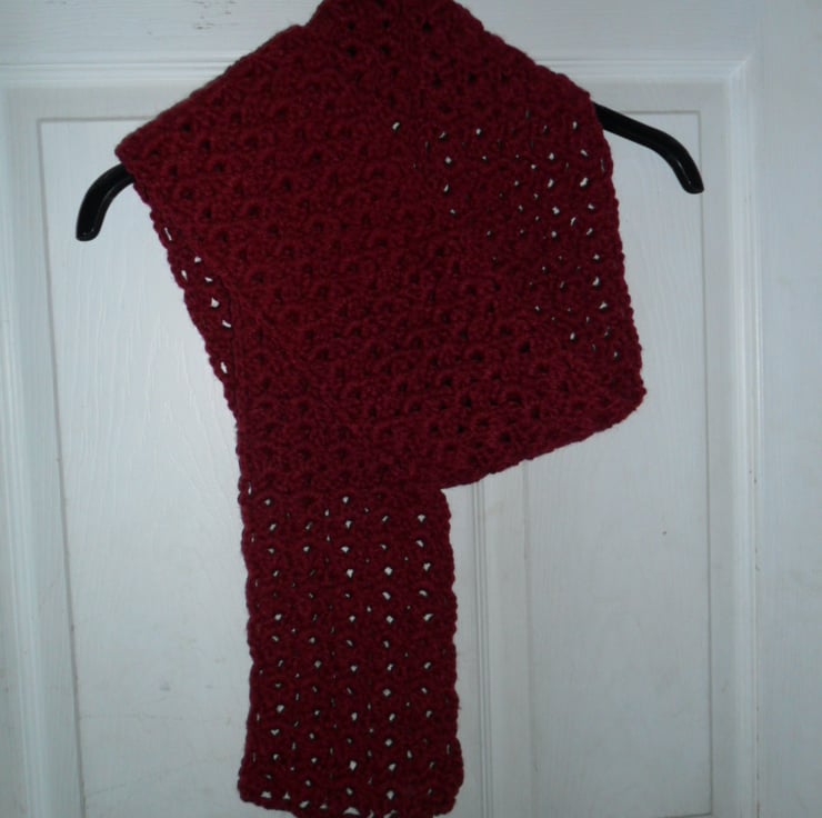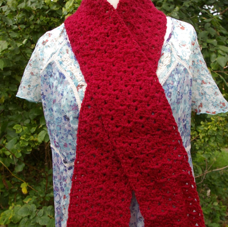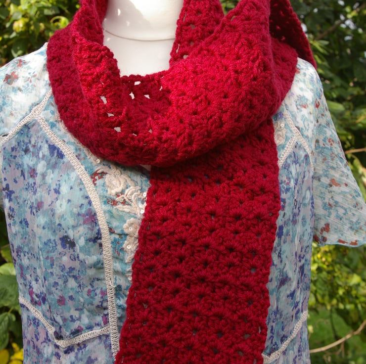 This scarf has been crocheted in Double V cluster with a 100% Acrylic Aran yarn. So it is nice and thick. It is just the thing to keep your neck warm on a cold winter evening.
