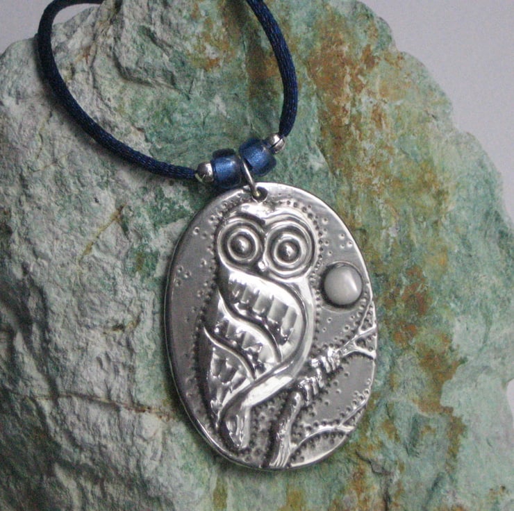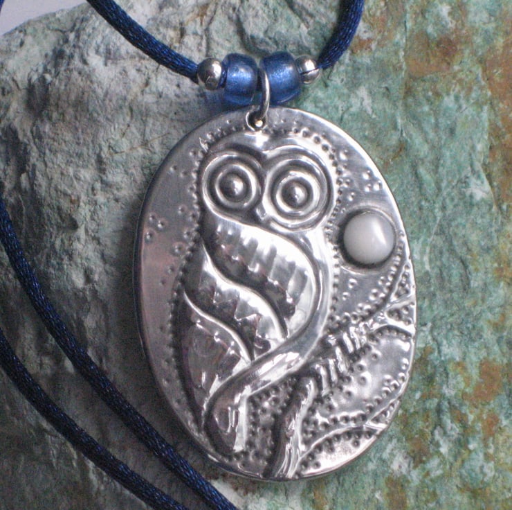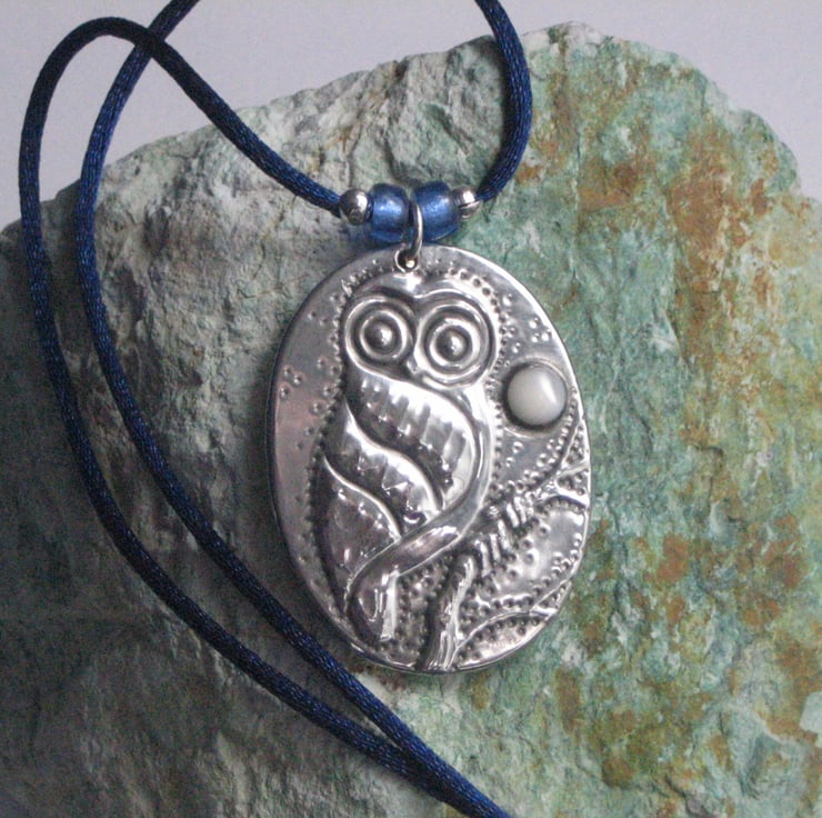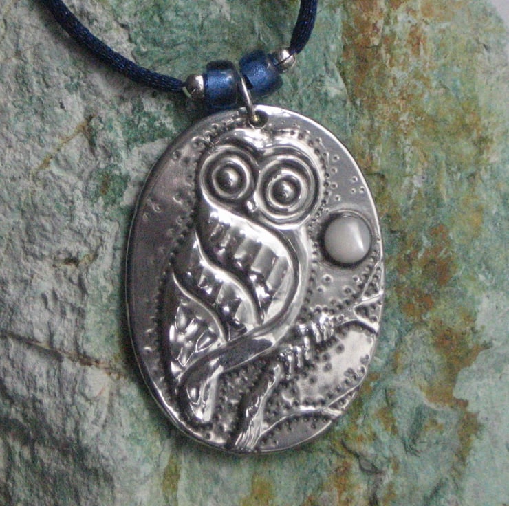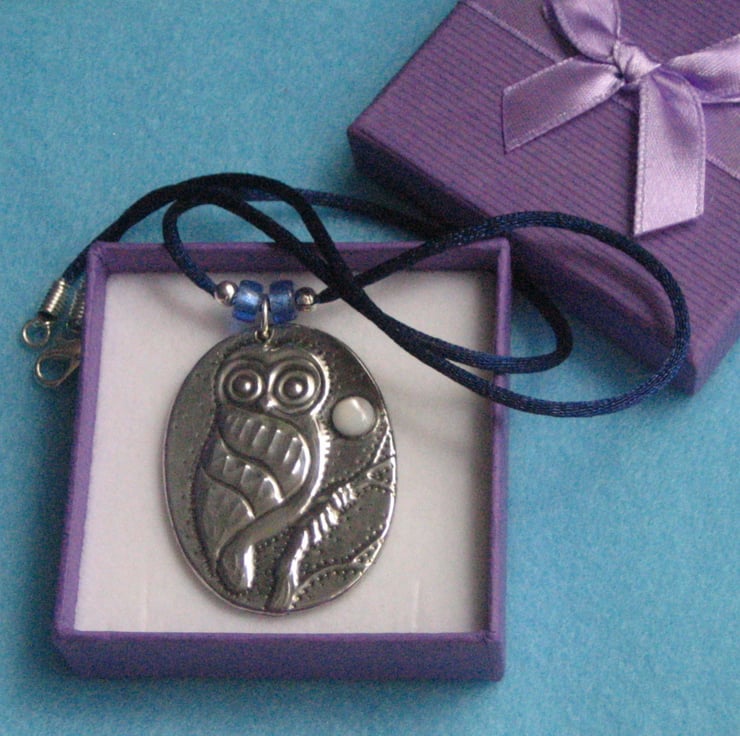 This little character sits beneath a mother of pearl moon, and has been handmade in modern lead-free pewter. Measuring 44mm x 33mm, it is suspended from a 44cm silky blue cord with with silvered glass beads and a lobster clasp fastening.