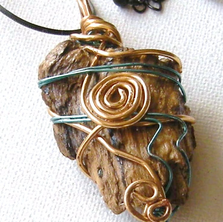 this is a piece of driftwood found on a local Cornish beach ...which has been wire wrapped in a gold plated and blue coloured wire ...on a 16 ins black leather effect cord necklace....size of driftwood pendant is approx. 2 ins long and 1 and half ins at it's widest point....it has a lobster clasp.....driftwood is cleaned and protected with durable laquer.......really unusual....unique necklace ,,,,will come in an organza gift pouch.