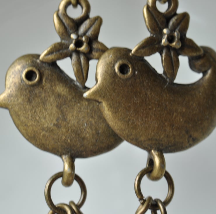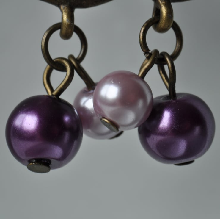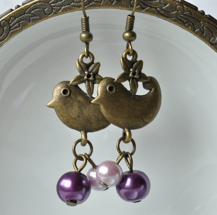 Lovely little handmade beaded earrings featuring an antique gold plated bird charm with lilac and dark purple glass pearls on antique gold plated earwires.