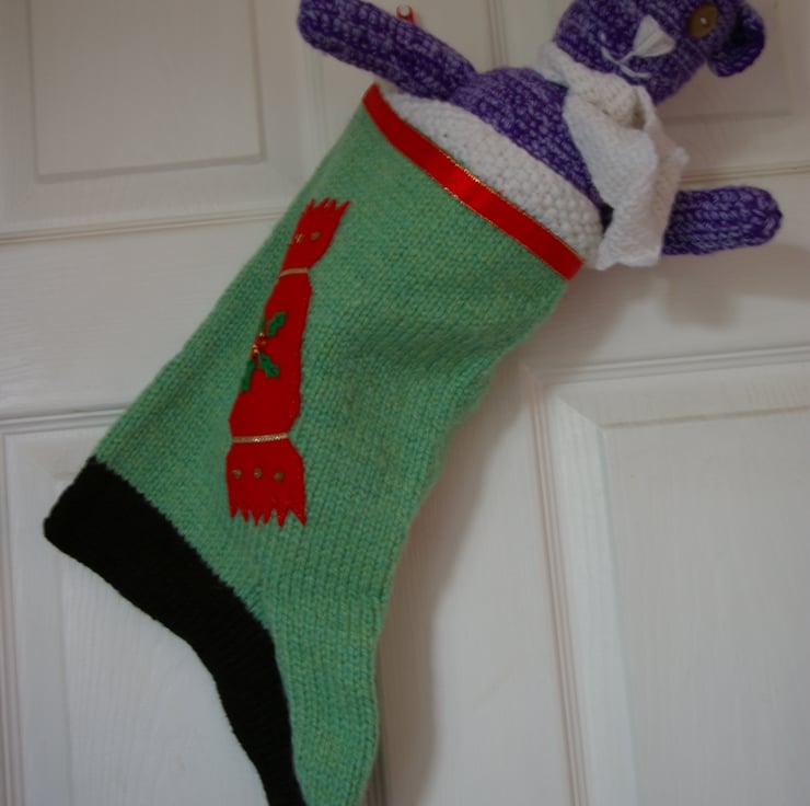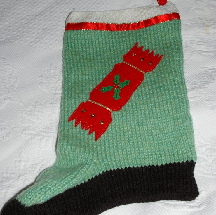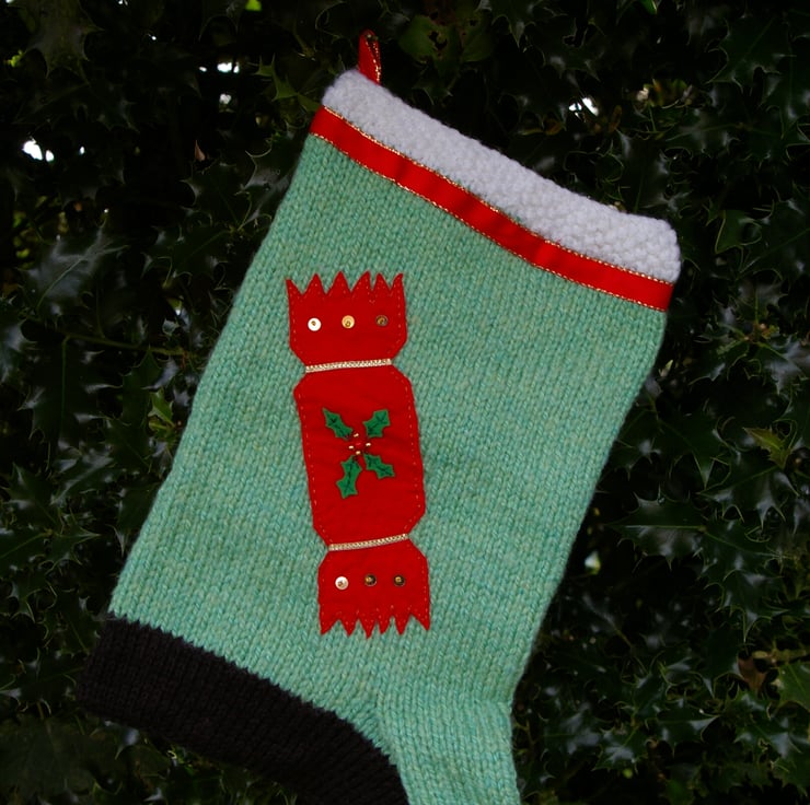 One pretty Christmas stocking knitted in green aran weight 100% acrylic yarn. The bottom of the stocking is in black while I have topped the stocking in white. There is a red and gold ribbon hand sewn around the top and a red felt cracker decoration hand sewn on both sides. I have used gold and red beads, gold sequins, gold braid and gold threads as embellishments on the felt crackers. There is a small red and gold ribbon loop to hang the stocking up by.
