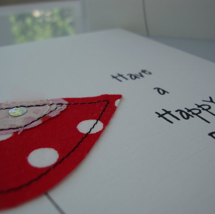 A cheeky little bird has been free machined onto white card to wish you a happy birthday.