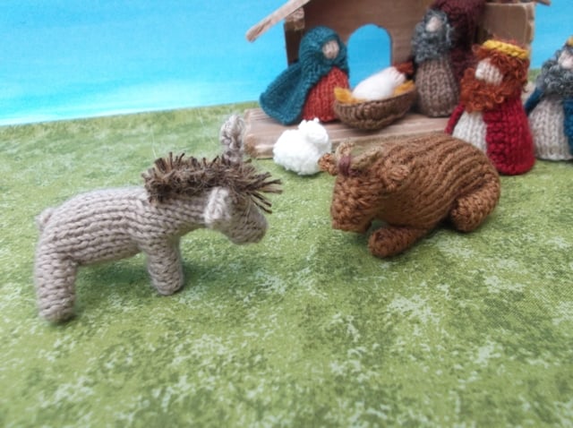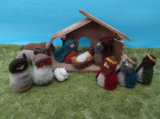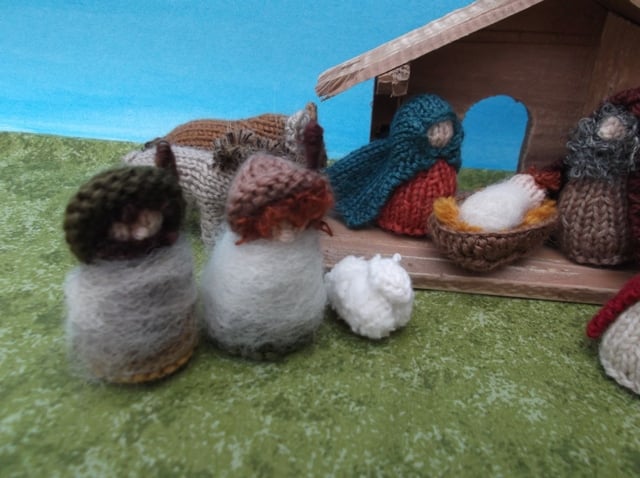 shepherds, 3 kings,and 3 animals, sheep, bull and donkey. They are all made knitted with 100% wool yarn, except the sheep has a small quantity of synthetics. The figures are about 5cm tall, stuffed with wool fleece. Not intended as a toy but safe.
