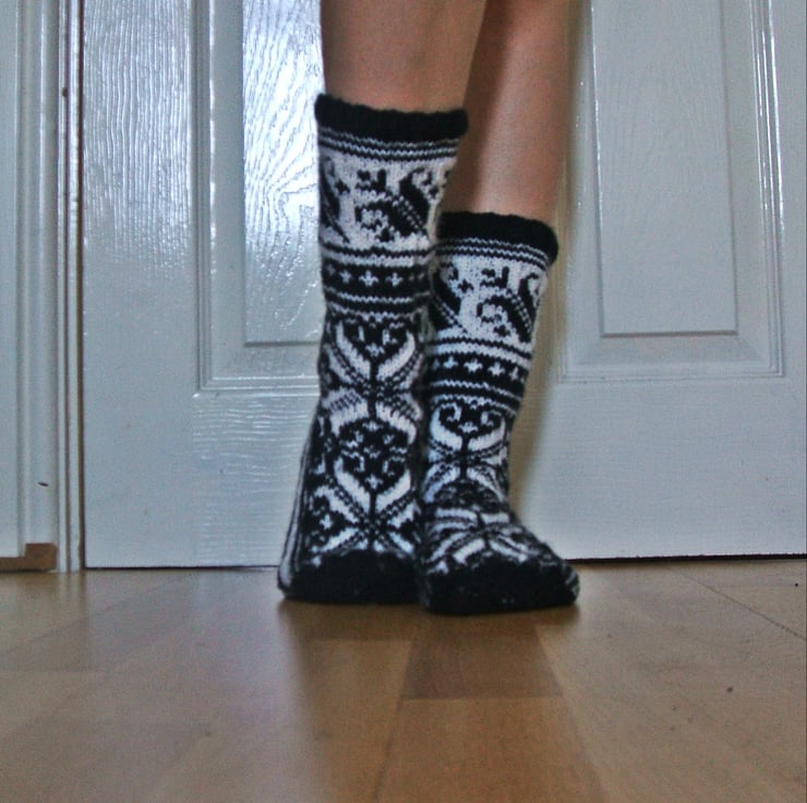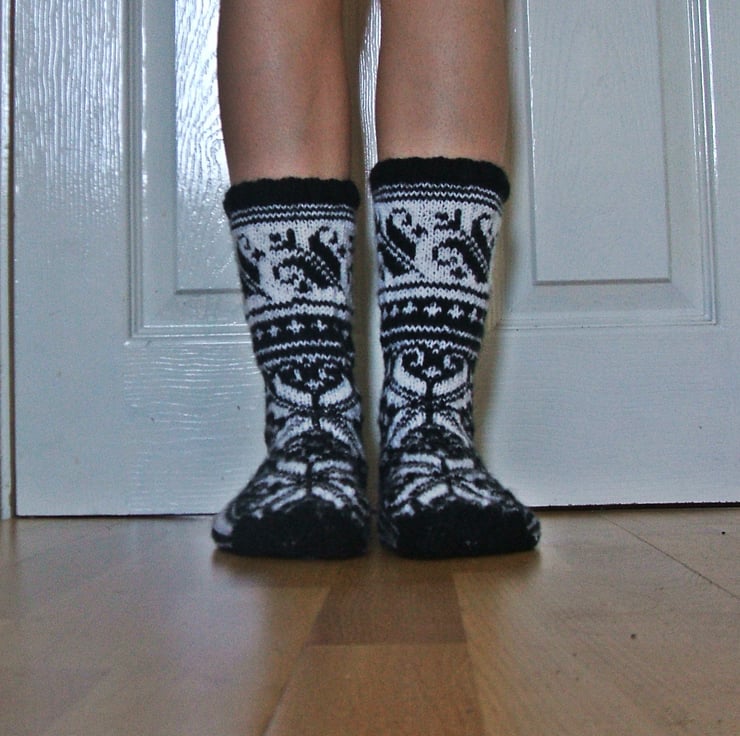 Medium-length socks with intricate scandinavian pattern, white and black wool, hand-knitted.