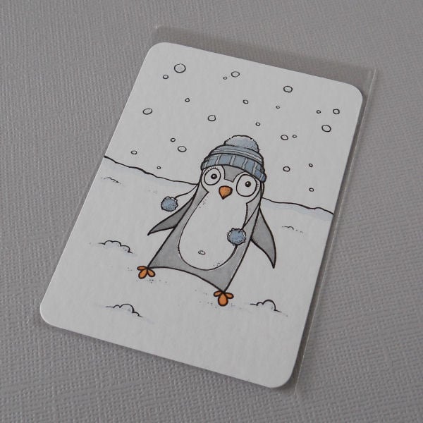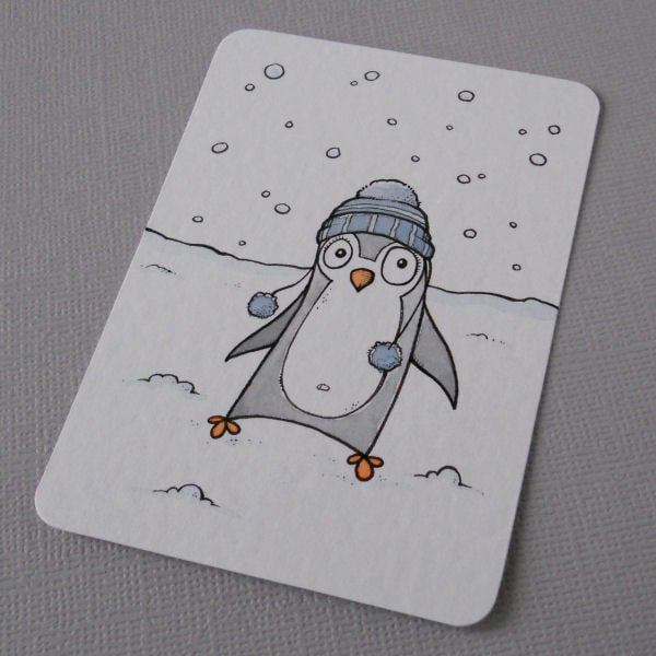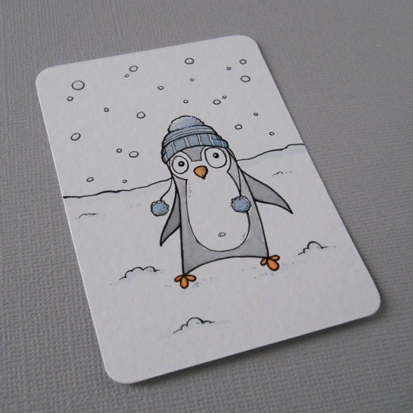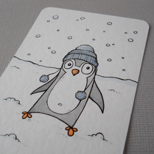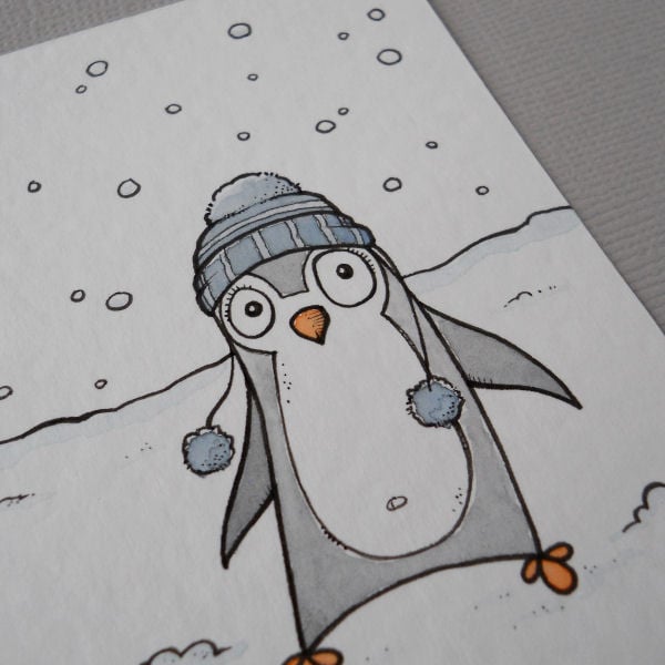 a little penguin all ready for winter in his wooly hat! he is disappointed he could not find a nice pair of mittens to match.