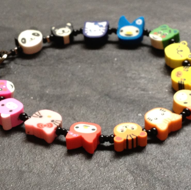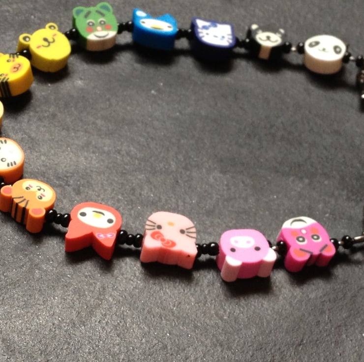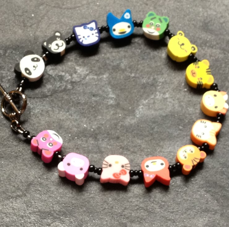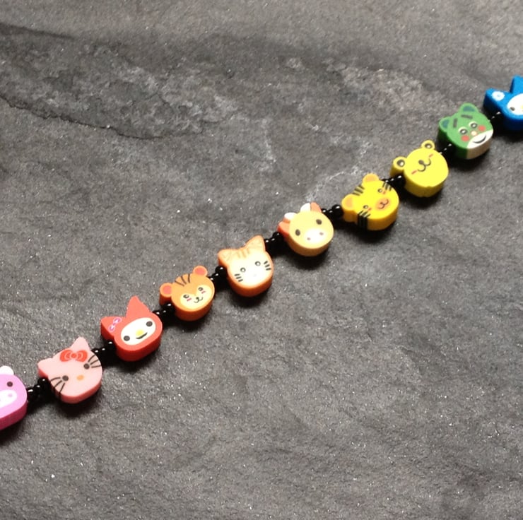 A cute, whimsical bracelet from the Kitsch Creations Animal Magic Collection, this item is lovingly constructed using miniature animal-themed polymer clay canes carefully placed in a rainbow configuration, off-set to dramatic effect with the simplest black seed beads and high quality black plated metal jewellery findings. The adorable animal canes used in this vibrant design are bound to attract attention! Yours will be highly similar to the design pictured, though sometimes animals go missing and are replaced by others!
