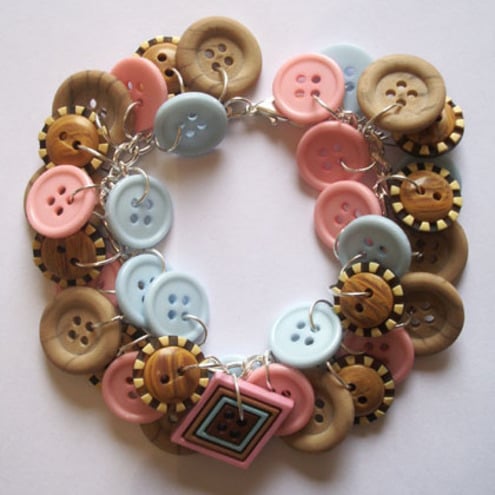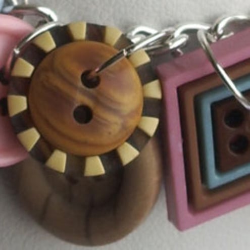 This distinctive button bracelet rich with a mix of brown wooden effect, pale blue and pink coloured buttons features a diamond shaped button of the same colour scheme. These are attached to a silver plated chain, which secures at the end with a silver plated lobster clasp fastener.