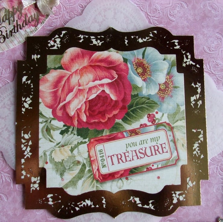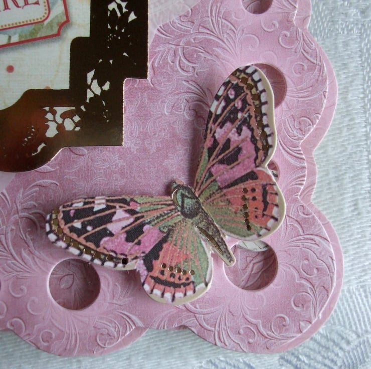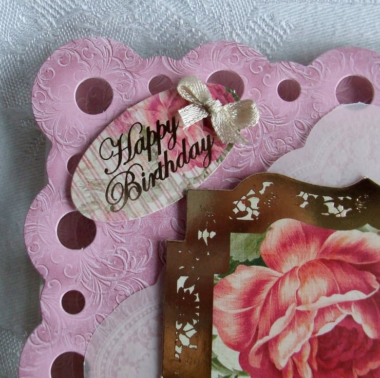 The base for this card is clear acetate which allows you to see through the circle holes punched around the edge of the pink scalloped square base to the topper. I've added a parchment doily at an angle then added the gold-foiled image of the rose. The top corner has an oval 'Happy Birthday' tag which I've decorated with a tiny ivory satin ribbon bow, in the bottom corner I've added a butterfly.