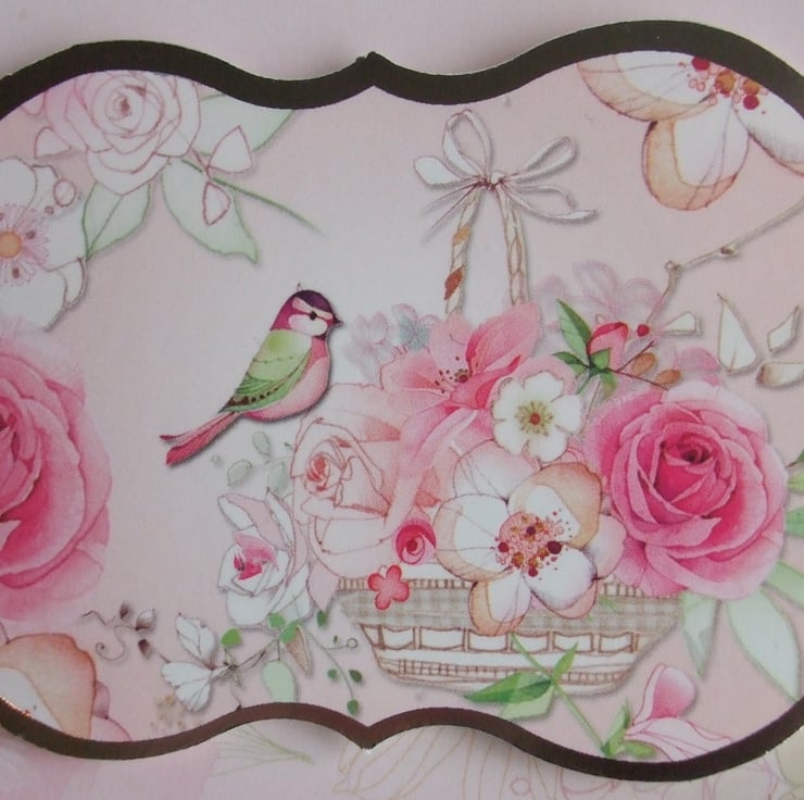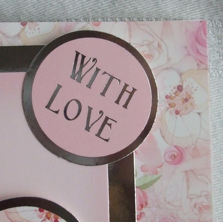 The front of this card is a pretty pink floral pattern, onto this I've placed a topper which I've made using a square of silver foil card topped with a pink square with a bird and flower design, onto this I've placed a shaped topper threaded with pink organza ribbon. I;ve added a circular 'With Love' greeting to the top corner of the square.