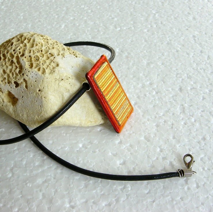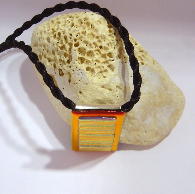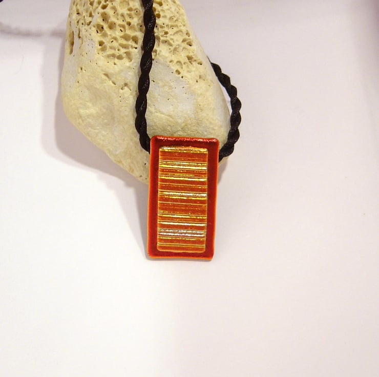 A fused glass pendant that is a base of metallic-red with an over-layer of textured red/gold dichroic glass that at some angles will also glint green/silver.