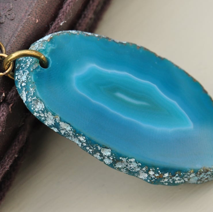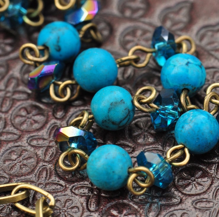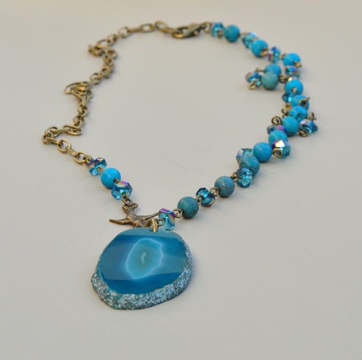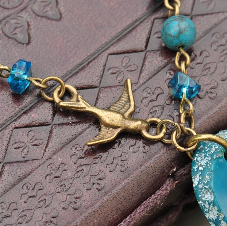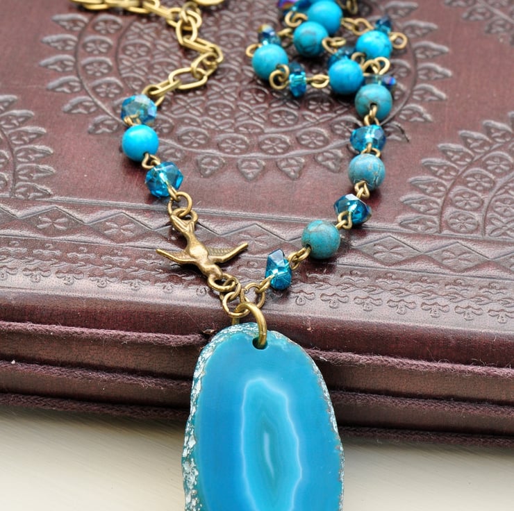 Lovely agate slice pendant which is a deep turquoise colour with one beaded strand of Turquoise gemstone rounds and lovely irregular bicone crystal beads with AB finish and one strand comprising a bird connector with irregular bicones and Turquoise bead finished with antique bronze plated chain.