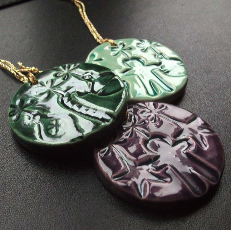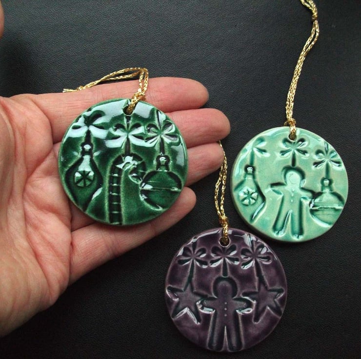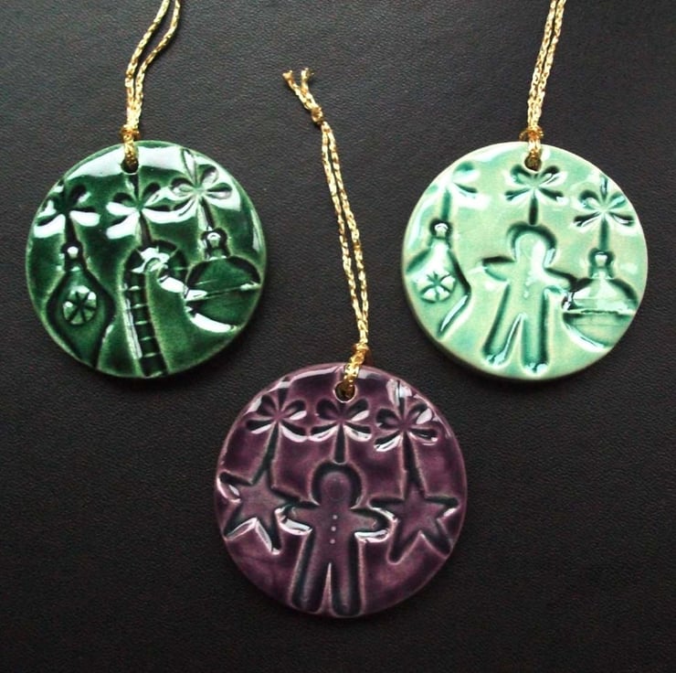 These cute little ceramic Christmas decorations are made from white earthenware clay and embossed with a variety of different patterns (from commercially available Stampin' Up stamps)