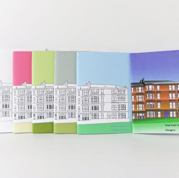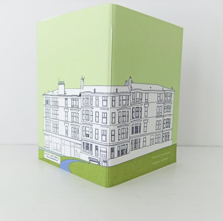 The wrap-around picture on the front and back of the journals is of a tenement in the West End of Glasgow.