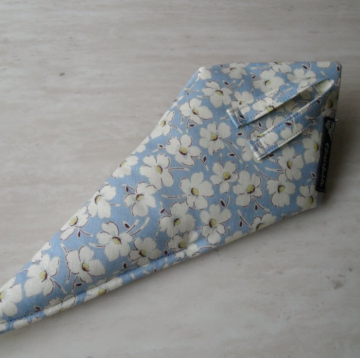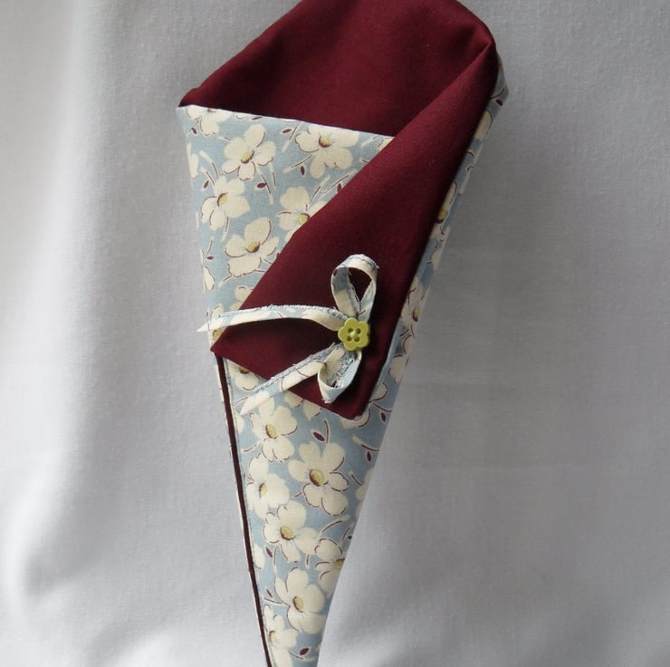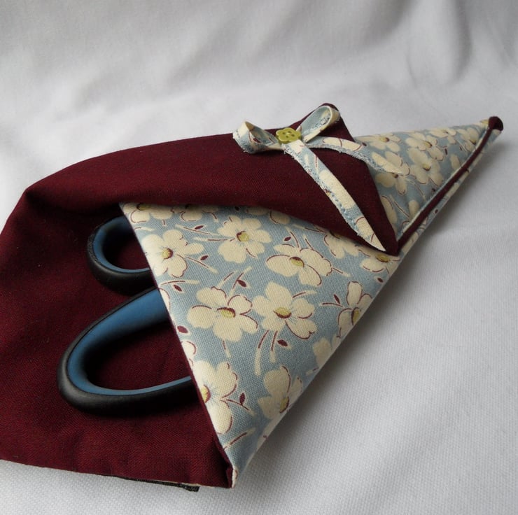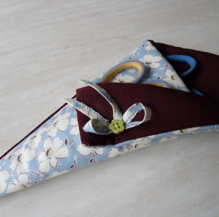 This holder is made from pure cotton fabric by Amy Butler which is called Wind Flower of Gypsy Caravan collection. The holder is well padded and lined with plain cotton. It can hold 2 pairs of scissors of different sizes. There is a fabric hook sewn at the back to allow the holder to be hooked onto a nearby piece of furniture - particularly useful in sewing when the pair of scissors is always covered by the fabric and the hook can also help to keep the scissors away from the hands of young children. The length of the holder is 12".