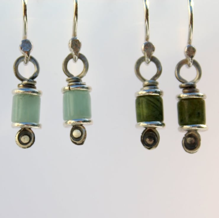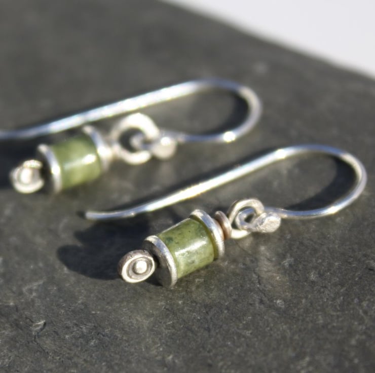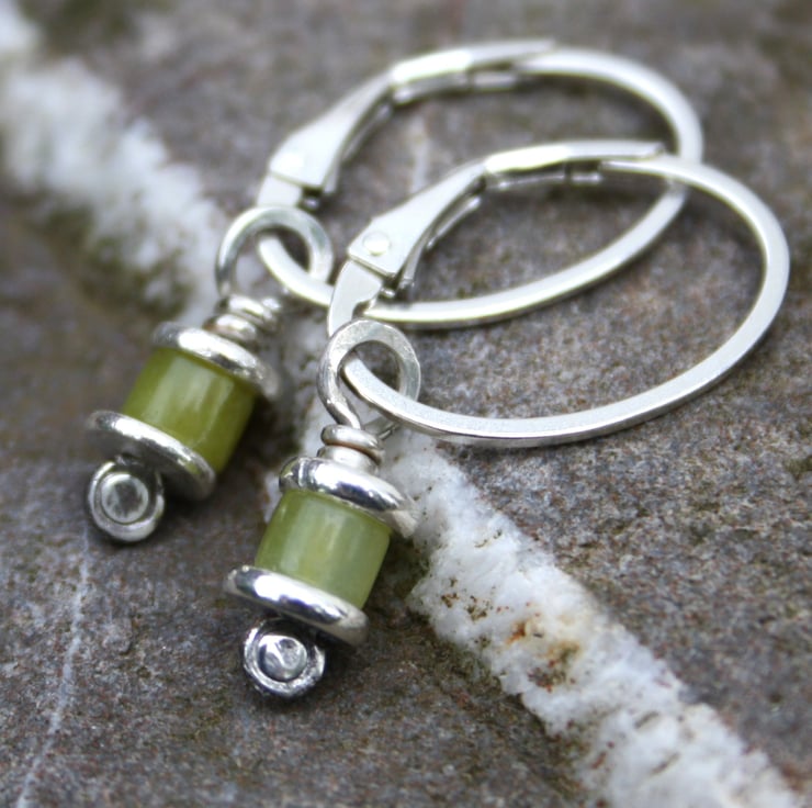 Forged sterling silver pins have been threaded through 5mm silver washer beads and muted green Nephrite jade heishi.
