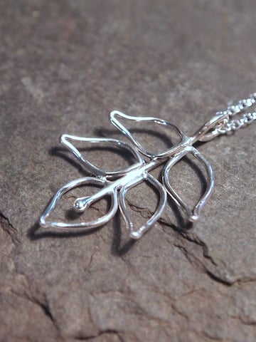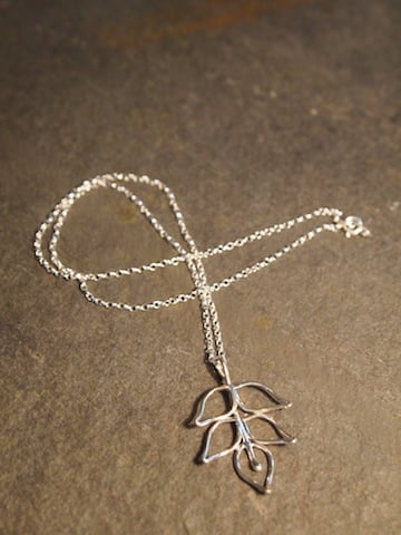 Five sterling silver leaves hanging on a stem of silver form this pendant. It hangs from an 18" belcher chain and has been polished to a high shine.